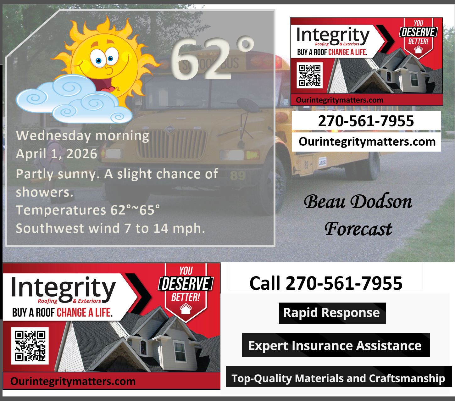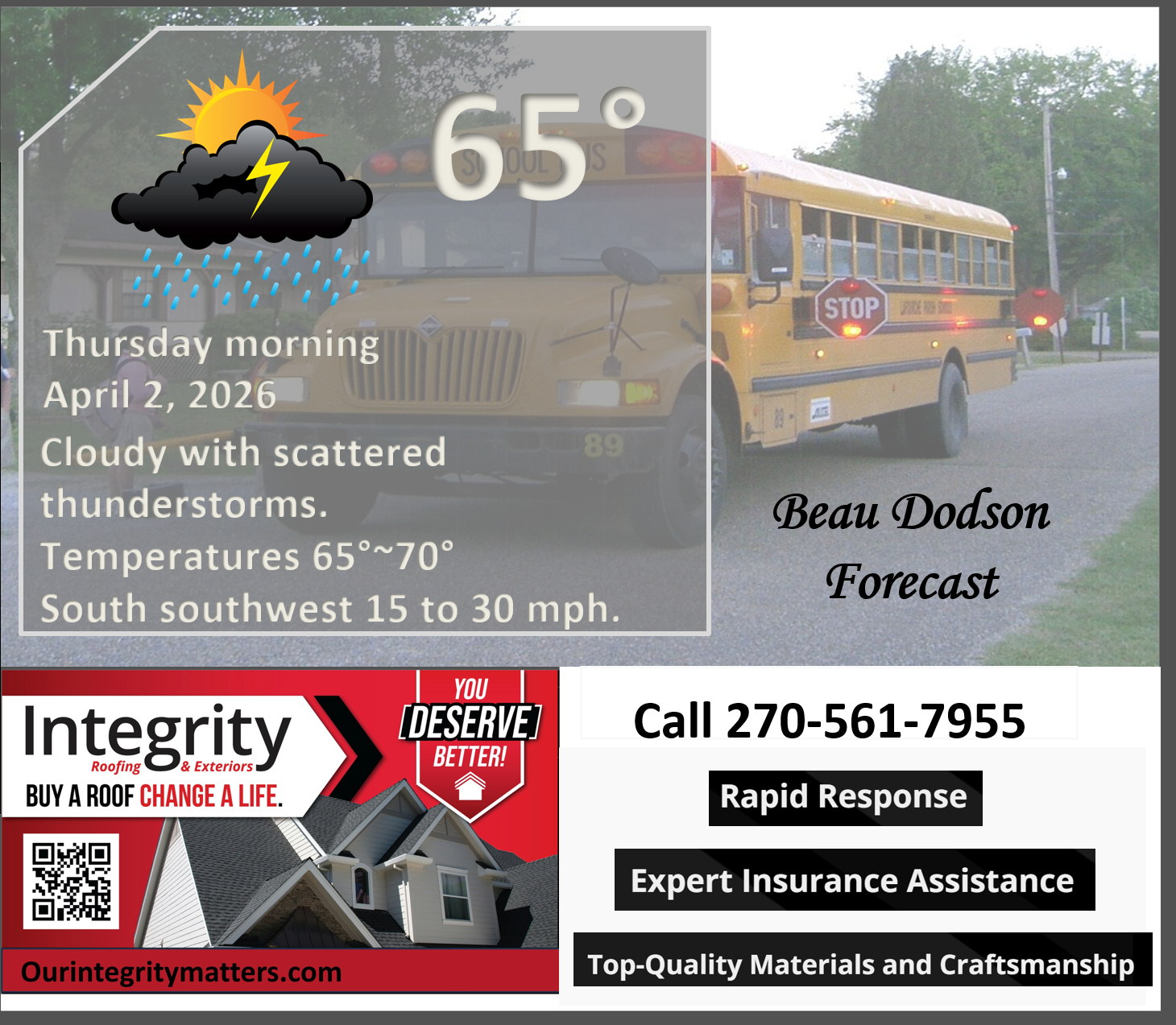 ⛈️ Roof or gutter damage from recent storms? Today’s weather is sponsored by Integrity Roofing. Check out their website at this link https://www.ourintegritymatters.com/