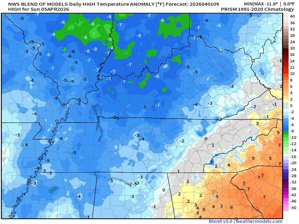Sunday’s anomalies (below average by Sunday). The numbers represent how many degrees below average temperatures will be. Highs in the 50s on Sunday.