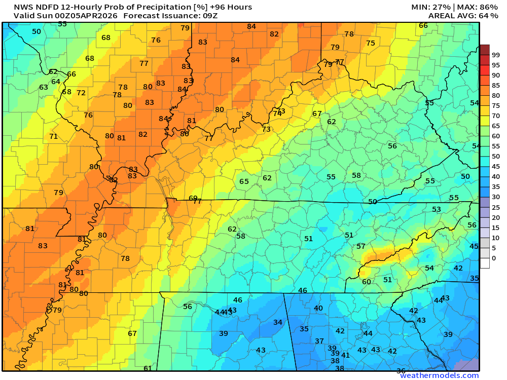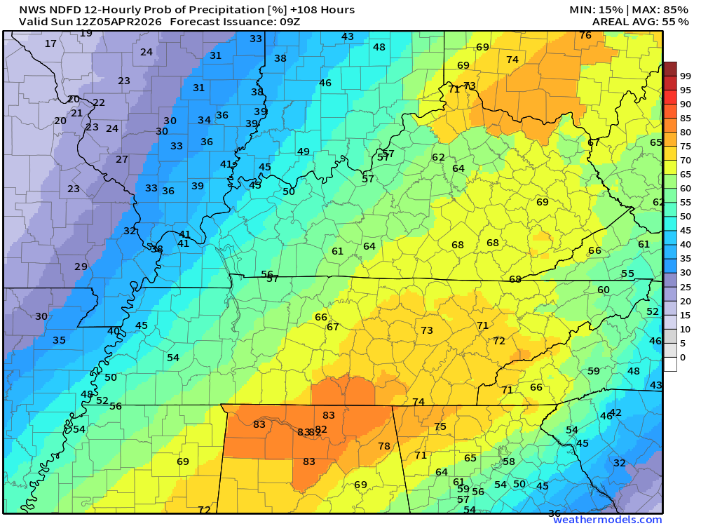 Easter Sunday should be dry (a slight chance of a shower before sunrise). It will be cooler. The ground will likely still be damp or wet from Saturday’s showers and thunderstorms.