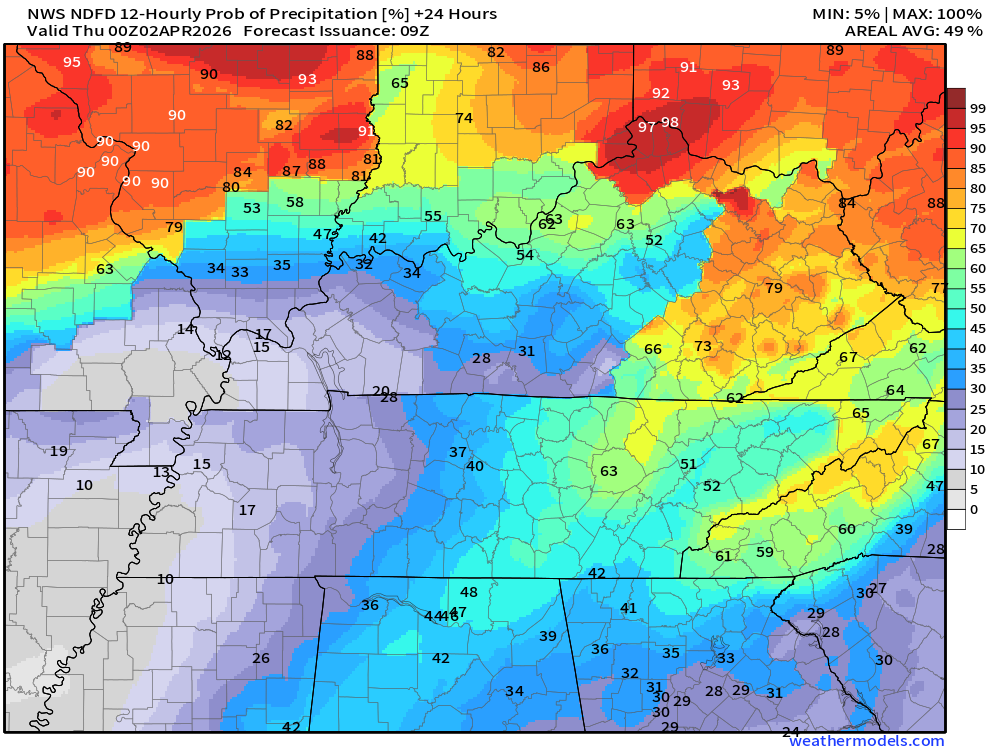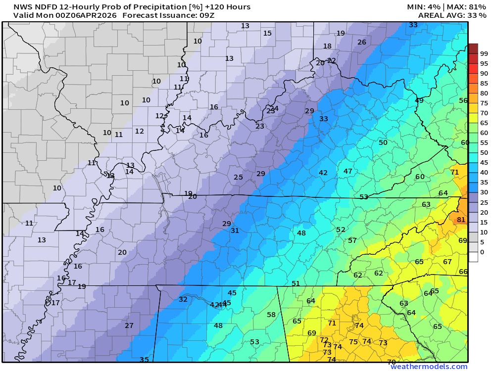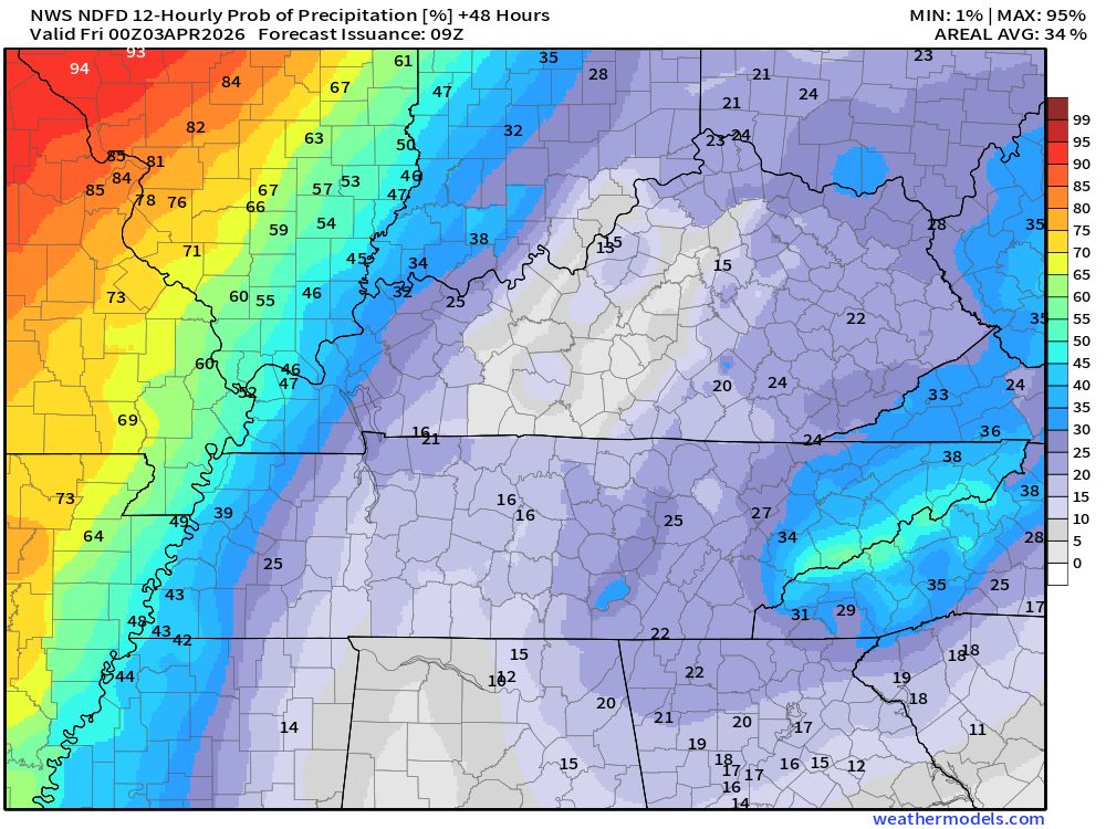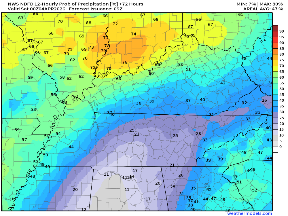 Keep in mind, this is a series of systems. Rain coverage will ebb and flow. Higher during some twelve-hour periods and lower during some twelve-hour periods.