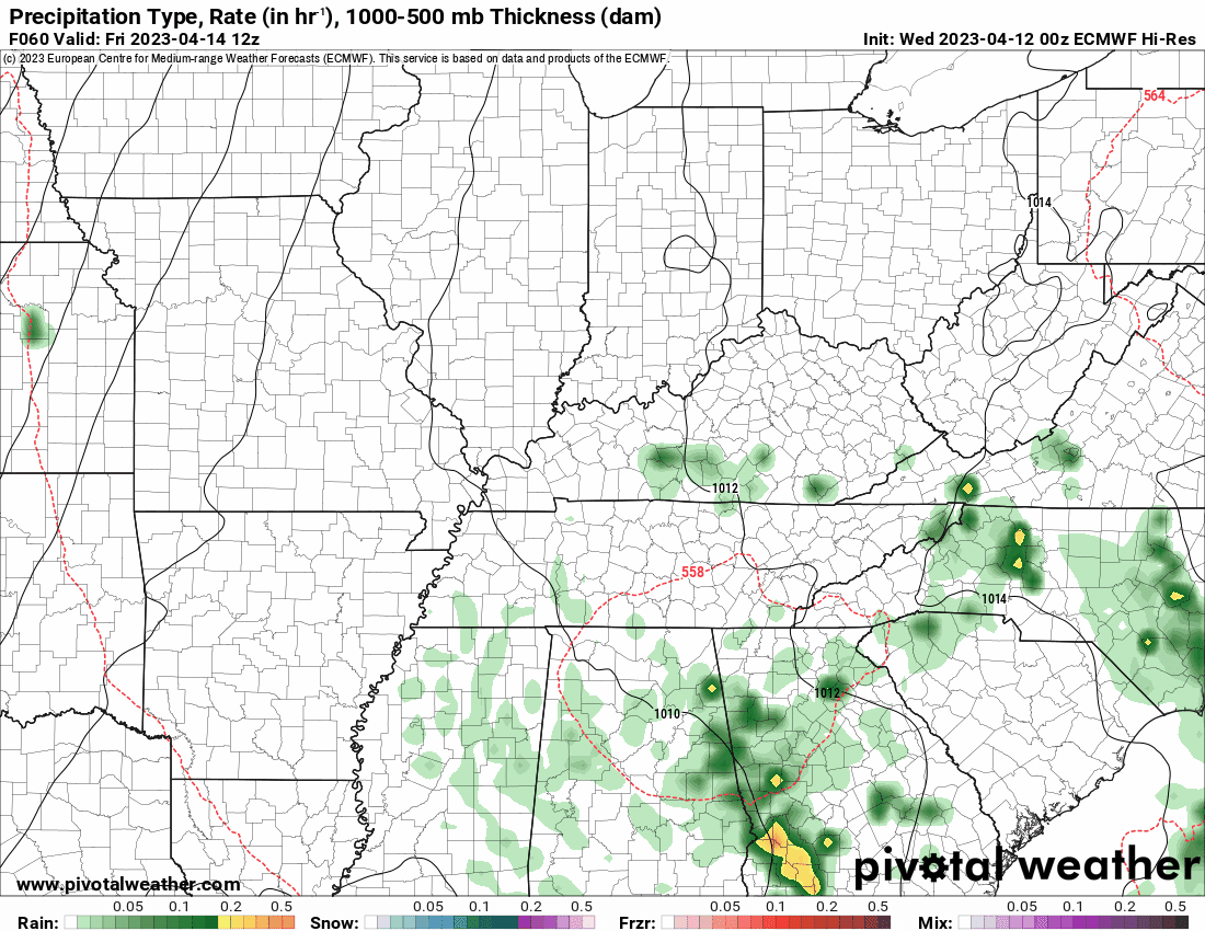 By Friday, the low will have moved far enough north northeast to bring a few showers and thunderstorms to western Tennessee and western Kentucky. The farther south and east you travel, the higher the chance of running into a shower or thunderstorm will be. The majority of the region will remain dry through Friday night.