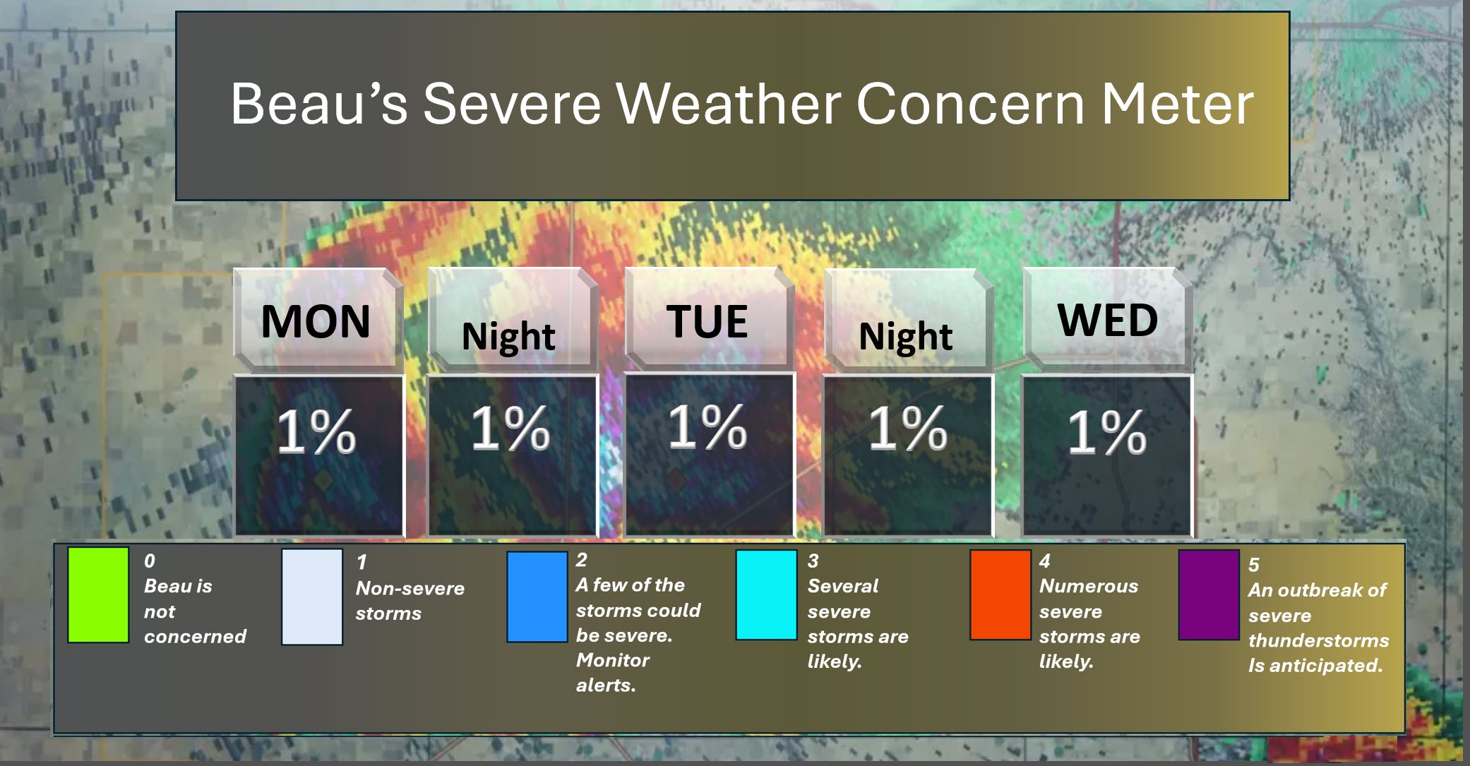 2. Are organized severe thunderstorms. MONITOR. I am monitoring Wednesday into the weekend. At this time, there are no strong signals for severe weather. A stronger cold front will arrive on Saturday. That would likely be the day with a bit higher chance of strong thunderstorms. I would not be surprised if we ended up with at least a low-end risk.