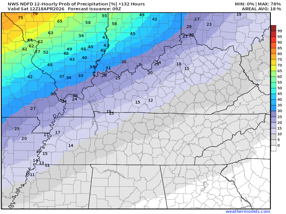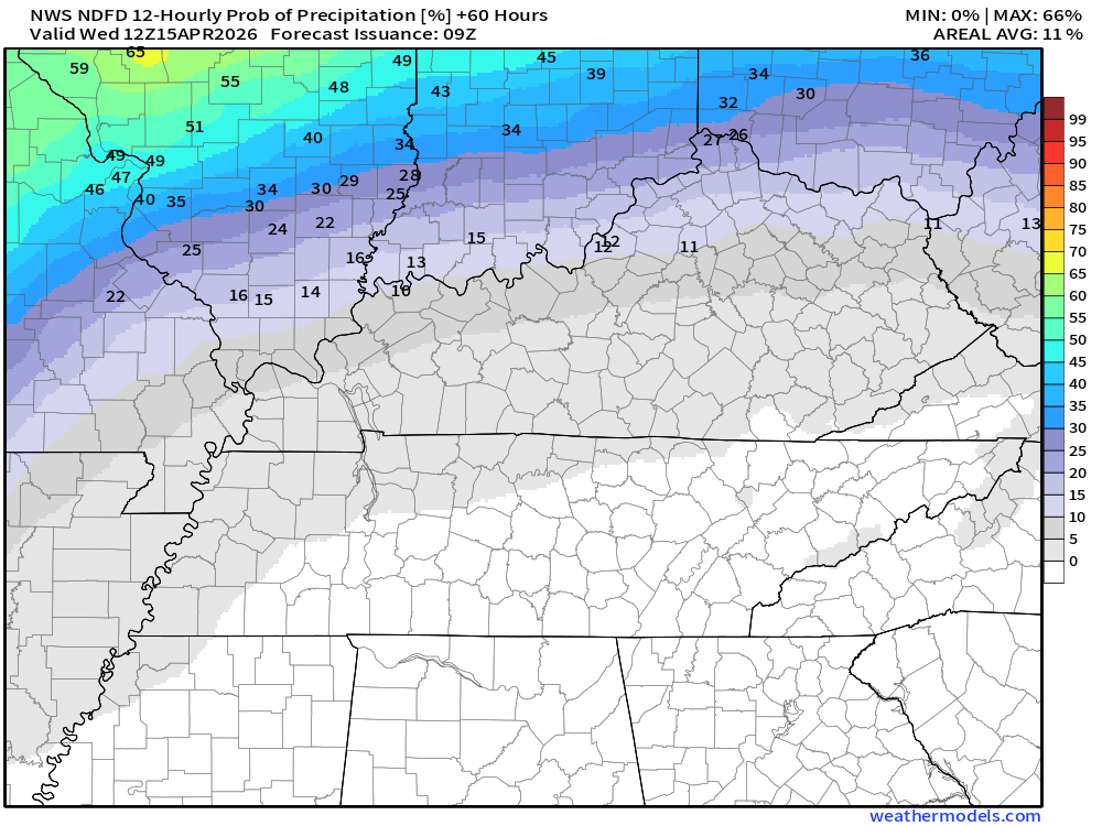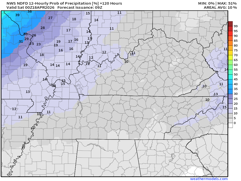 Peak chances will be Wednesday night and Thursday. Another peak on Saturday and Saturday night (along a cold front). Otherwise, lower chances for each 12 to 24 hour period (see graphics below).