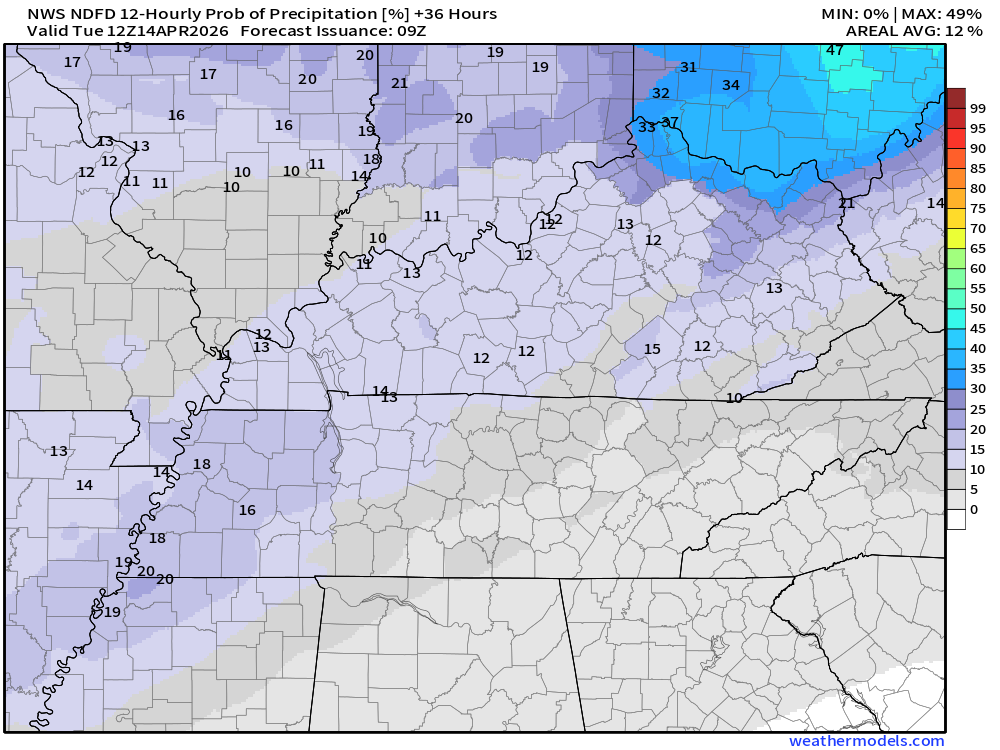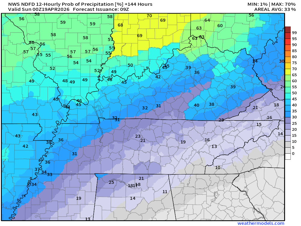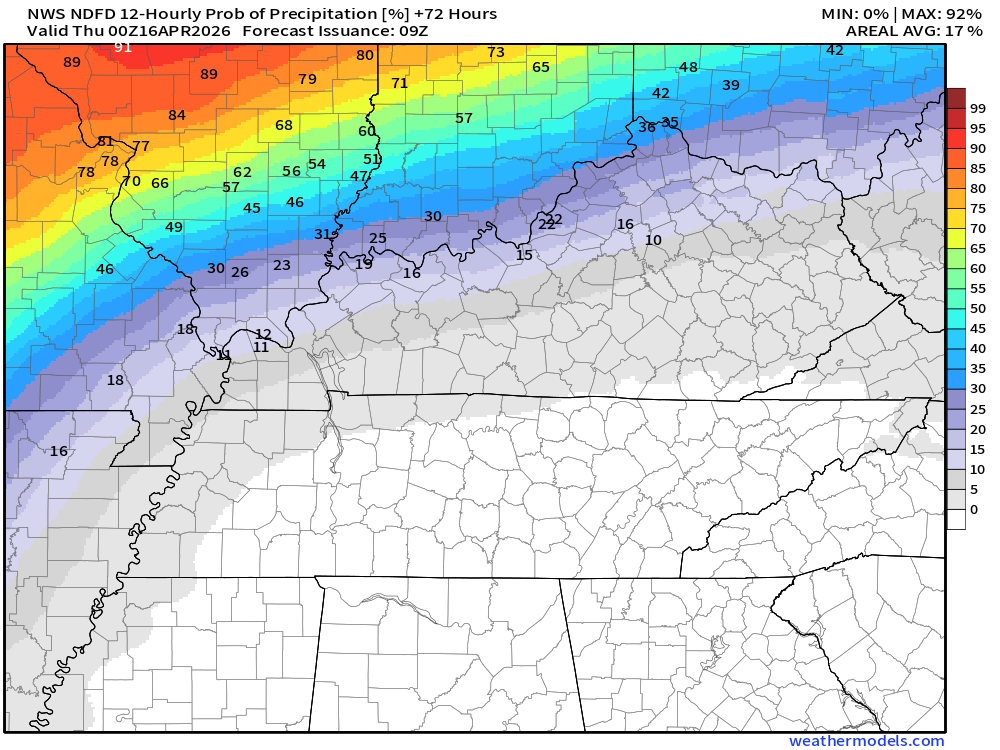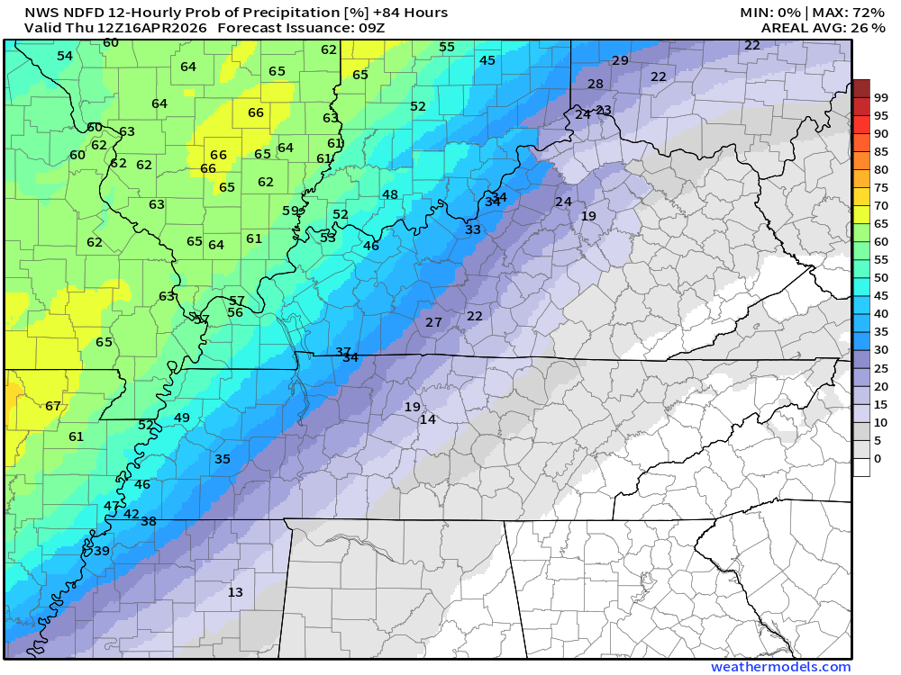 This next graphic is the % chance of rain from 7 AM Thursday to 7 PM Thursday