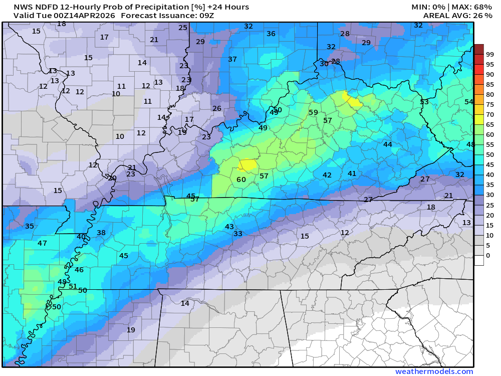 This next graphic is the % chance of rain from 7 AM Tuesday to 7 PM Tuesday