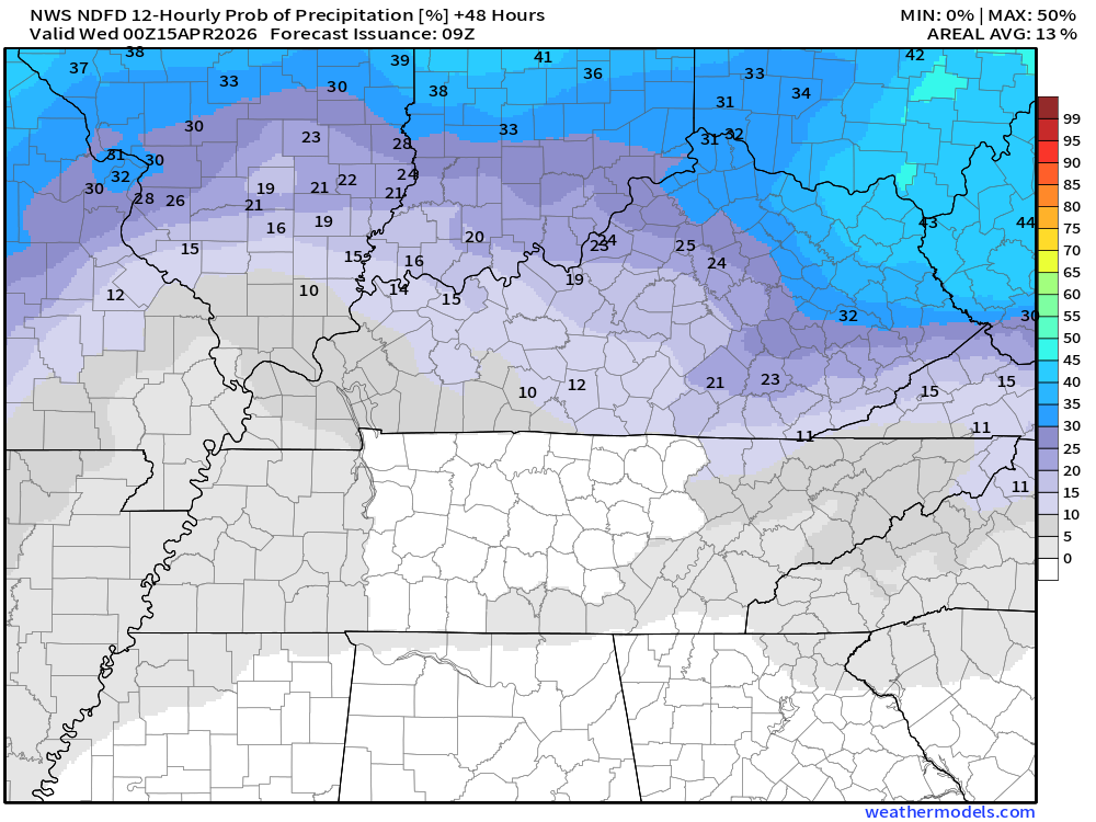 This next graphic is the % chance of rain from 7 AM Wednesday to 7 PM Wednesday