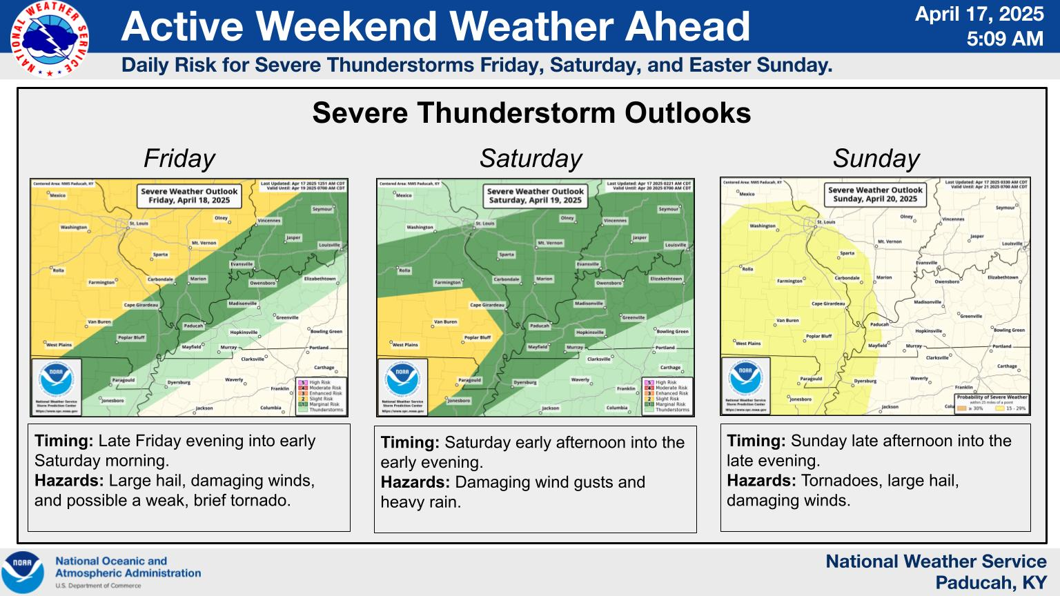•   Peak severe weather chances will likely arrive on Sunday afternoon and night.  Monitor updates.