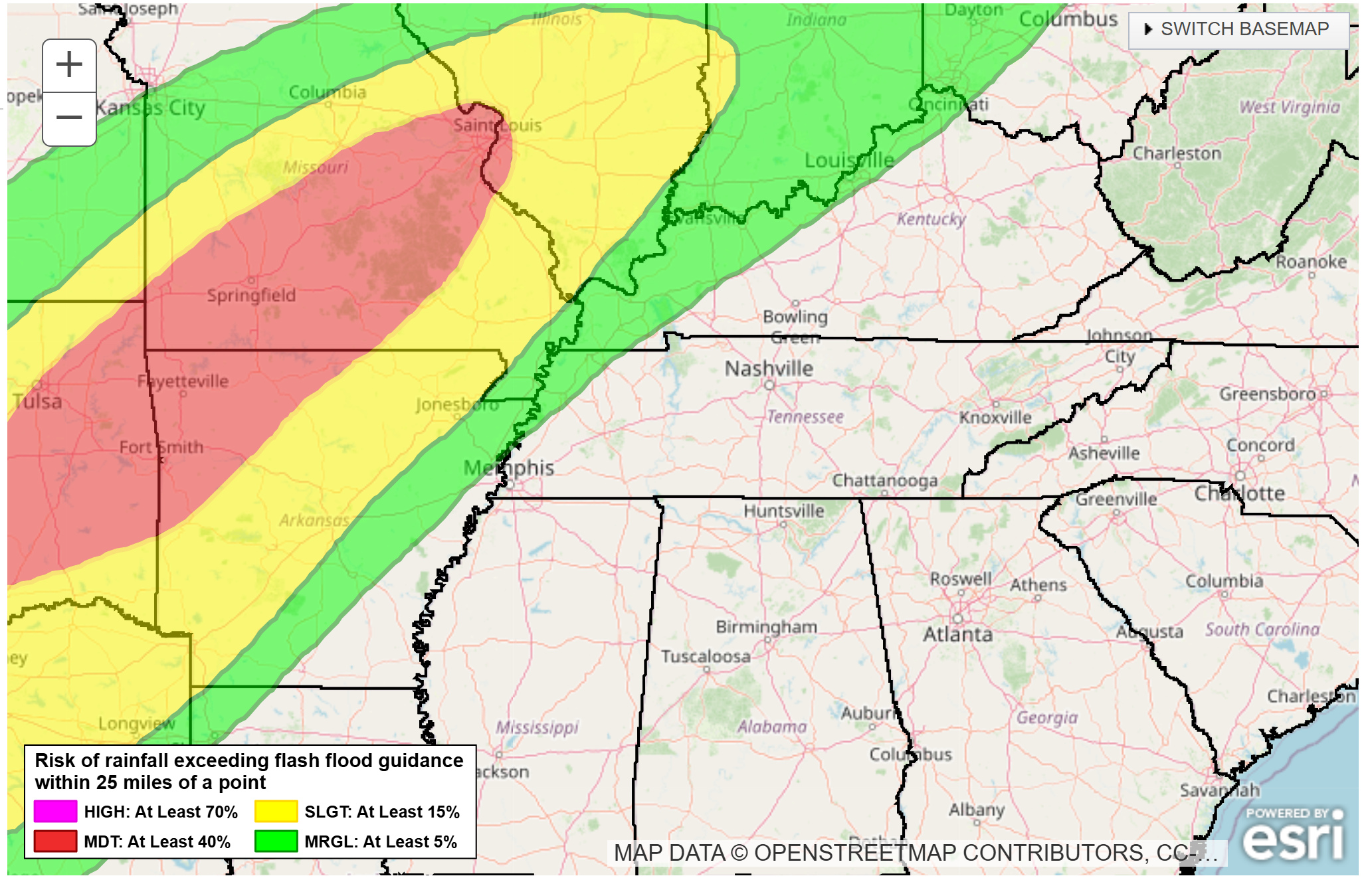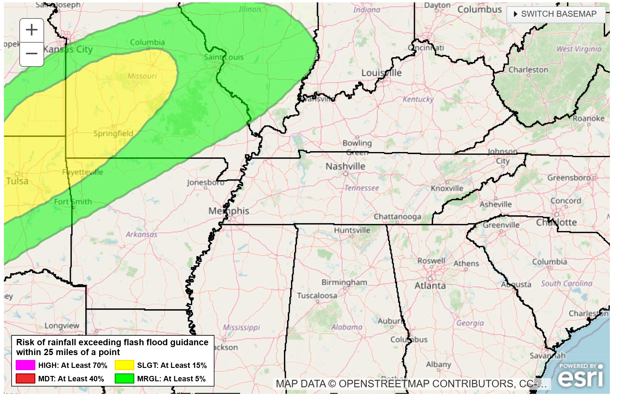 A marginal and slight risk of flash flooding across portions of southeast Missouri and southern Illinois.  That does extend into portions of Kentucky and Tennessee.