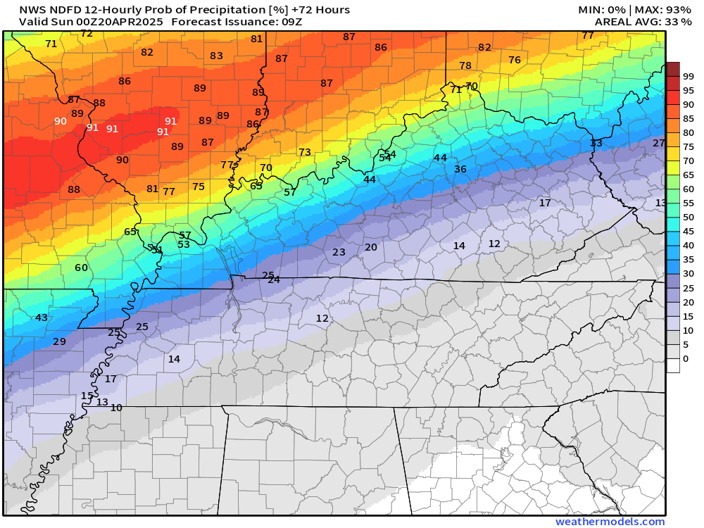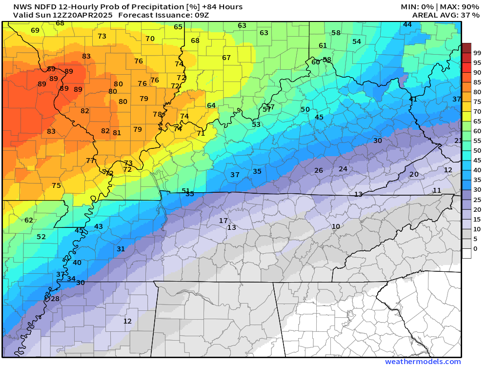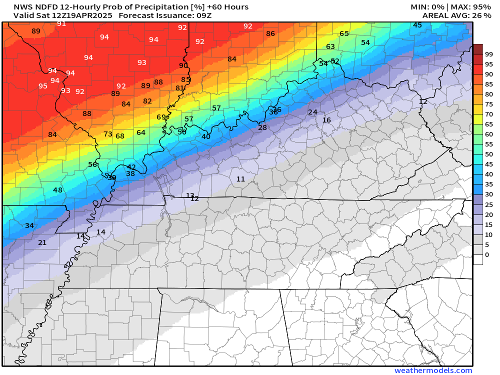 Saturday’s rain probabilities.  Again, higher over Missouri and Illinois.
