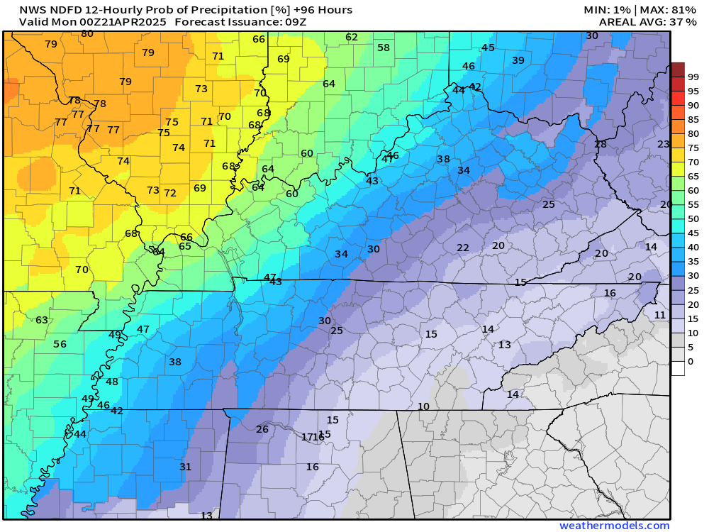 I kept a low-end chance of showers and thunderstorms on Monday, but the system may push east of our region by that time.  Leaving our region dry.