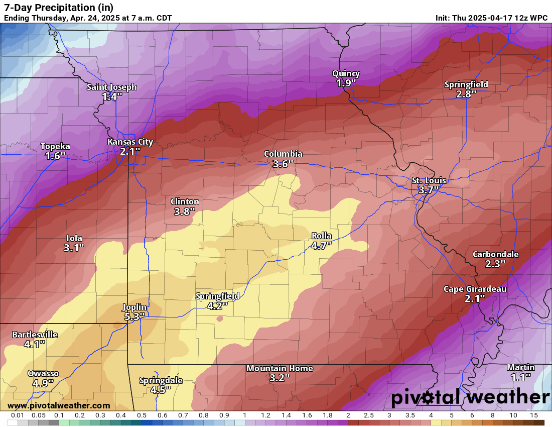 Notice the bulk of the rain falls across Missouri and Illinois.