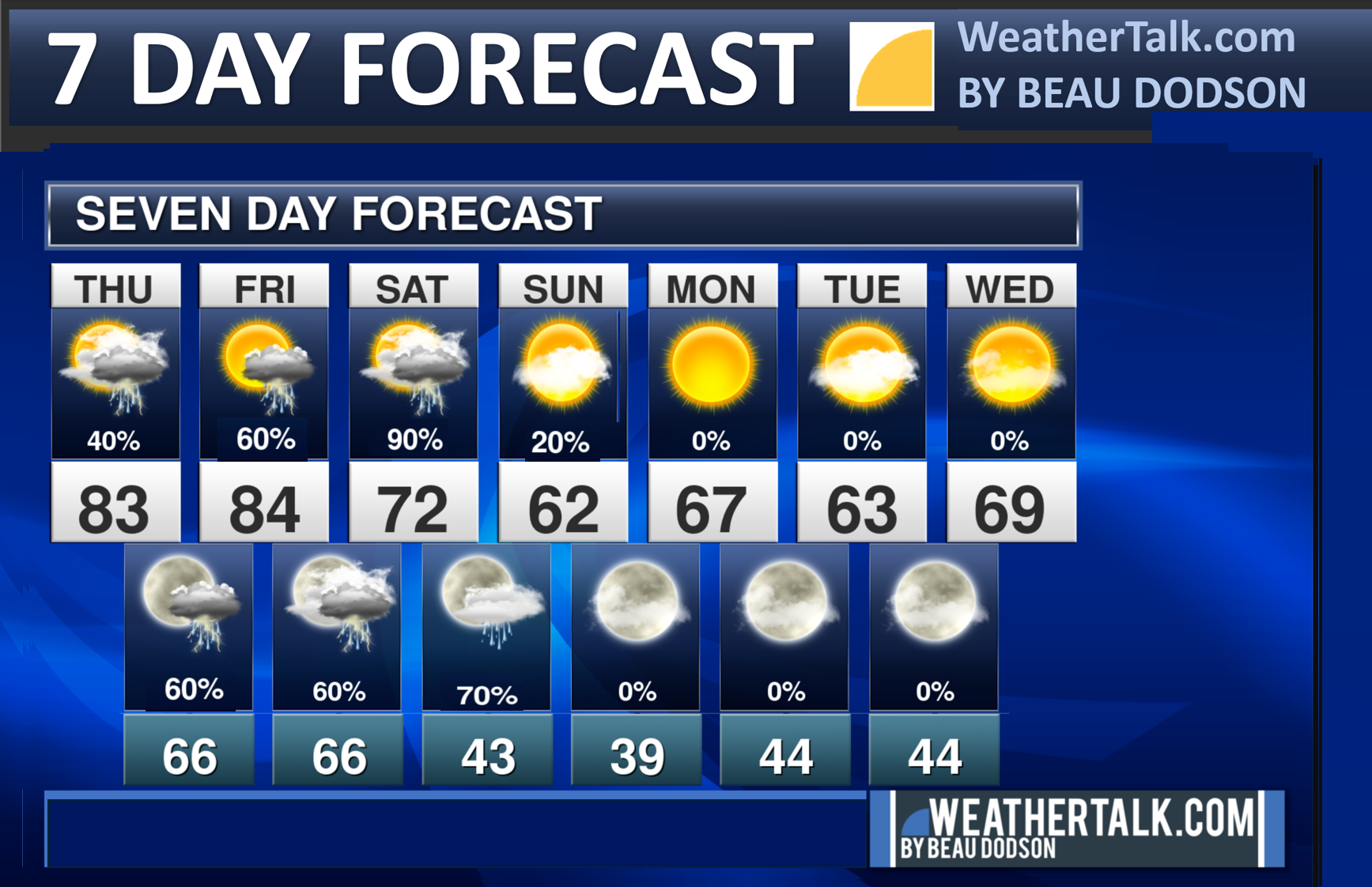 On-and-off showers and thunderstorms will result from this series of fronts. See the video and the graphics above and below for the rain chances for each 12-hour period.