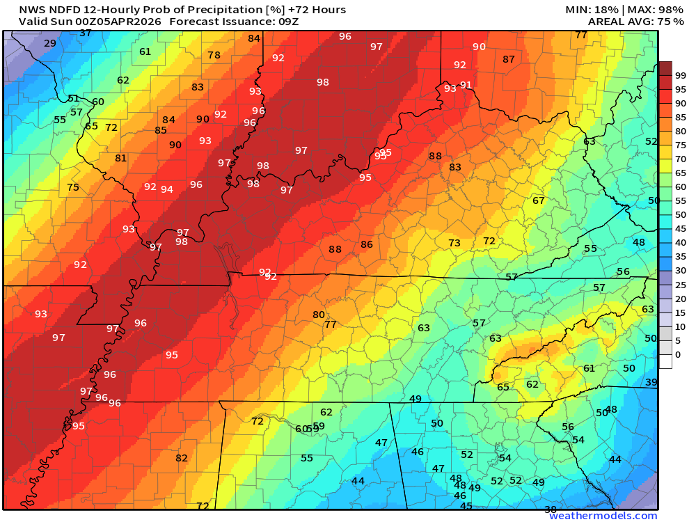 Let’s take a look at the twelve-hour rainfall probabilities. What is the % chance of showers and thunderstorms?