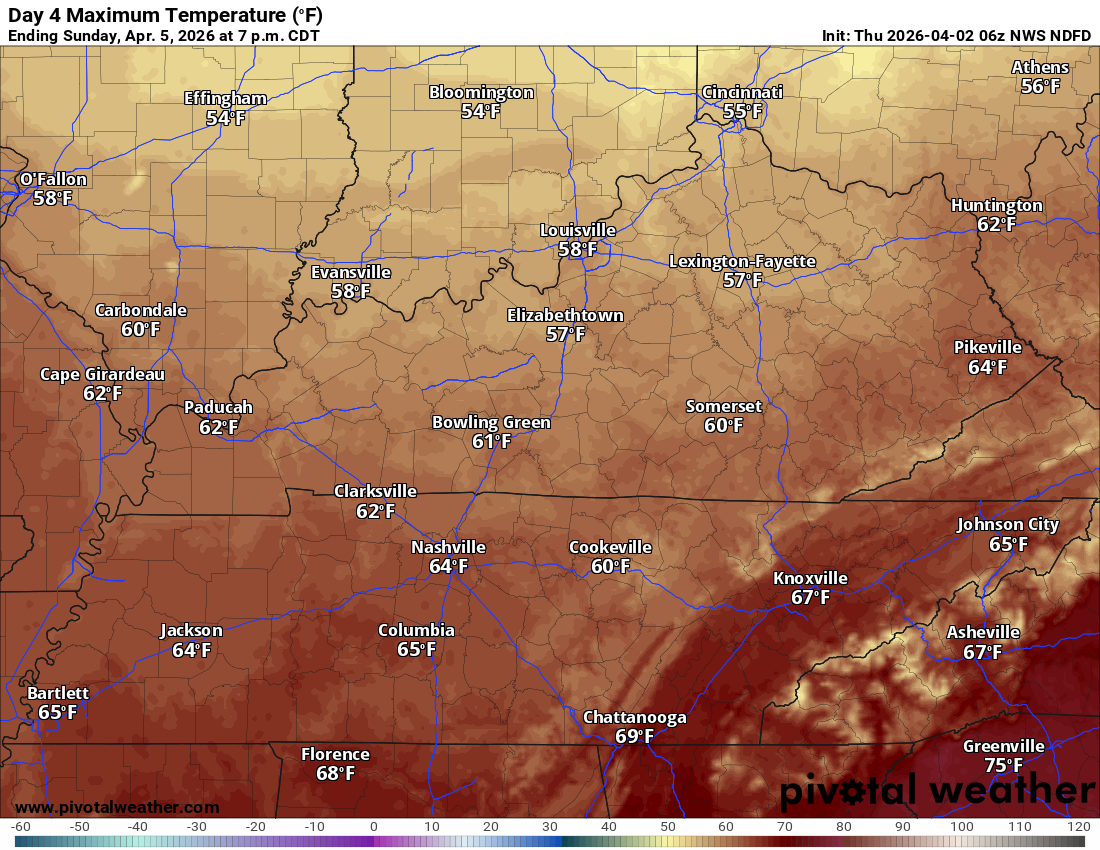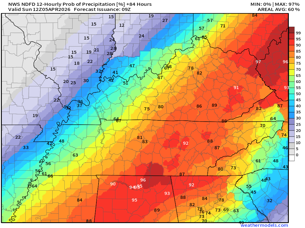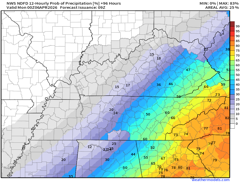 Easter Sunday should be dry (a slight chance of a shower before sunrise). It will be cooler. The ground will likely still be damp or wet from Saturday’s showers and thunderstorms.