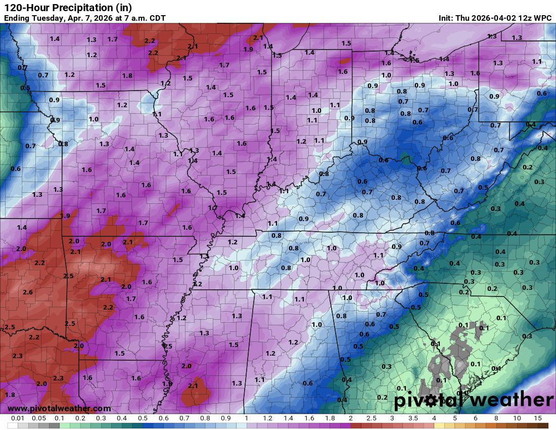 Notice the area of lower totals over portions of Kentucky and Tennessee (lower as you travel eastward).