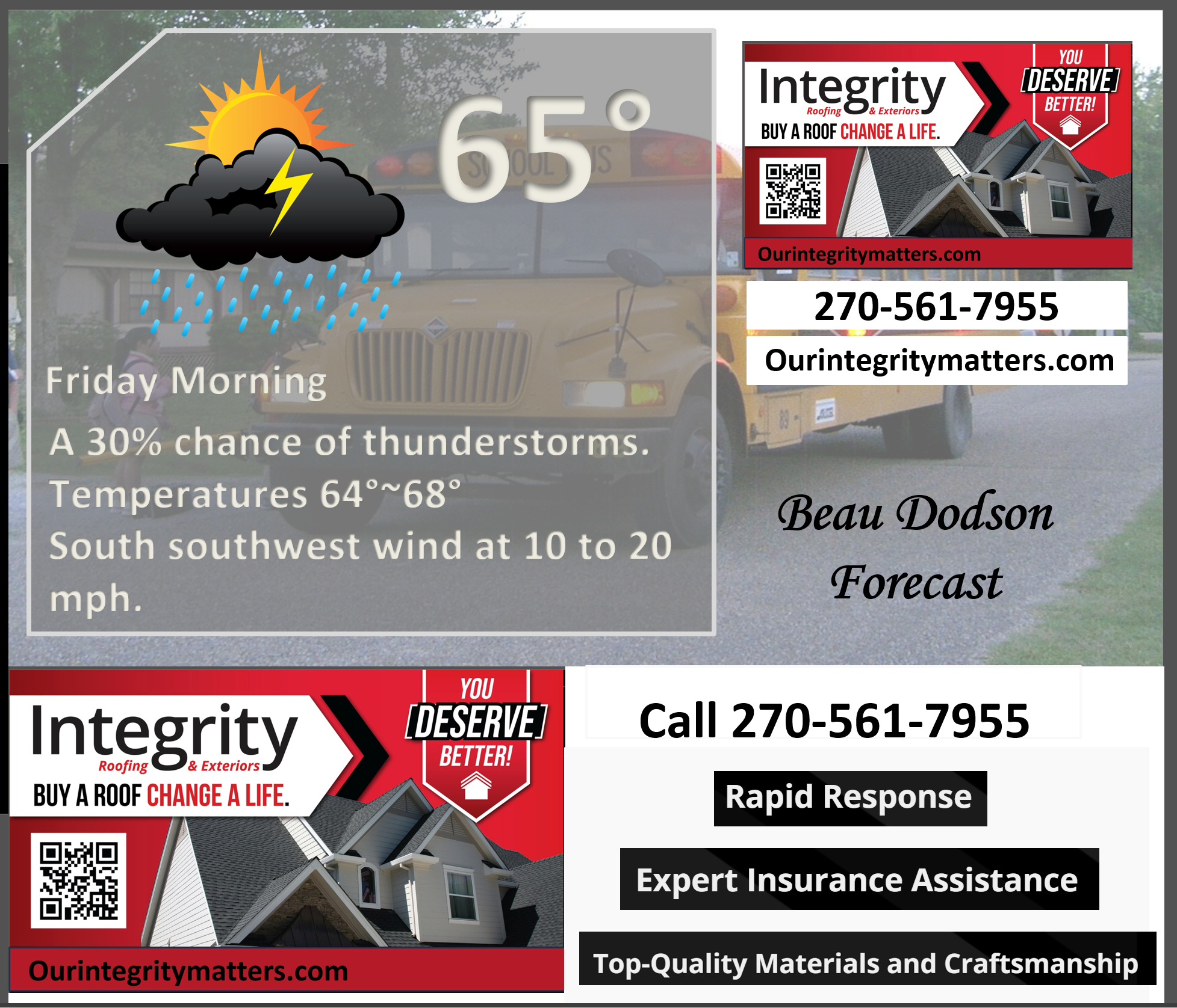 ⛈️ Roof or gutter damage from recent storms? Today’s weather is sponsored by Integrity Roofing. Check out their website at this link https://www.ourintegritymatters.com/