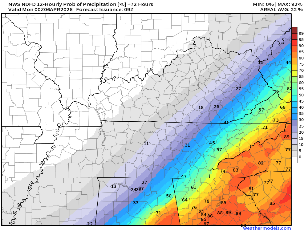 Notice the area of lower totals over portions of Kentucky and Tennessee (lower as you travel eastward).