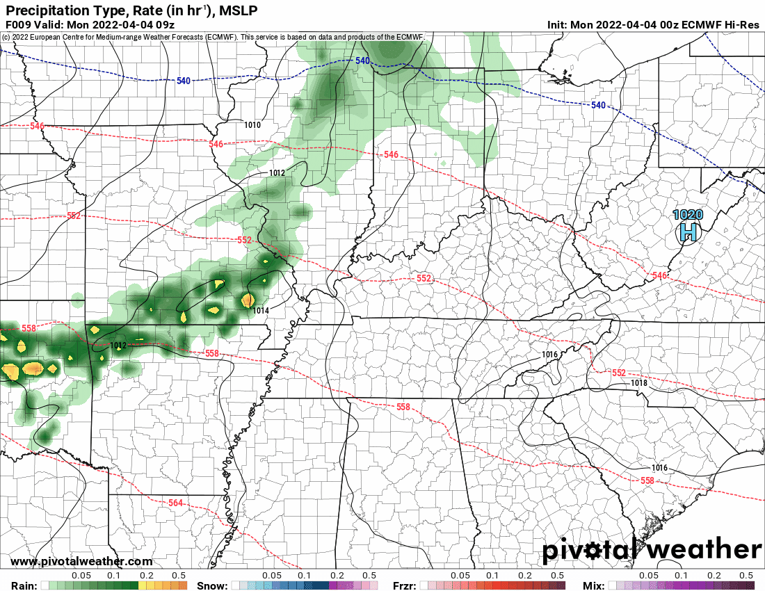 Temperature range: MO Bootheel 56° to 58° / SE MO 54° to 56° / I-64 Corridor of South IL 54° to 56° / South IL 54° to 56° / Northwest KY (near Indiana border) 54° to 56° / West KY 54° to 56° / NW TN 54° to 58°