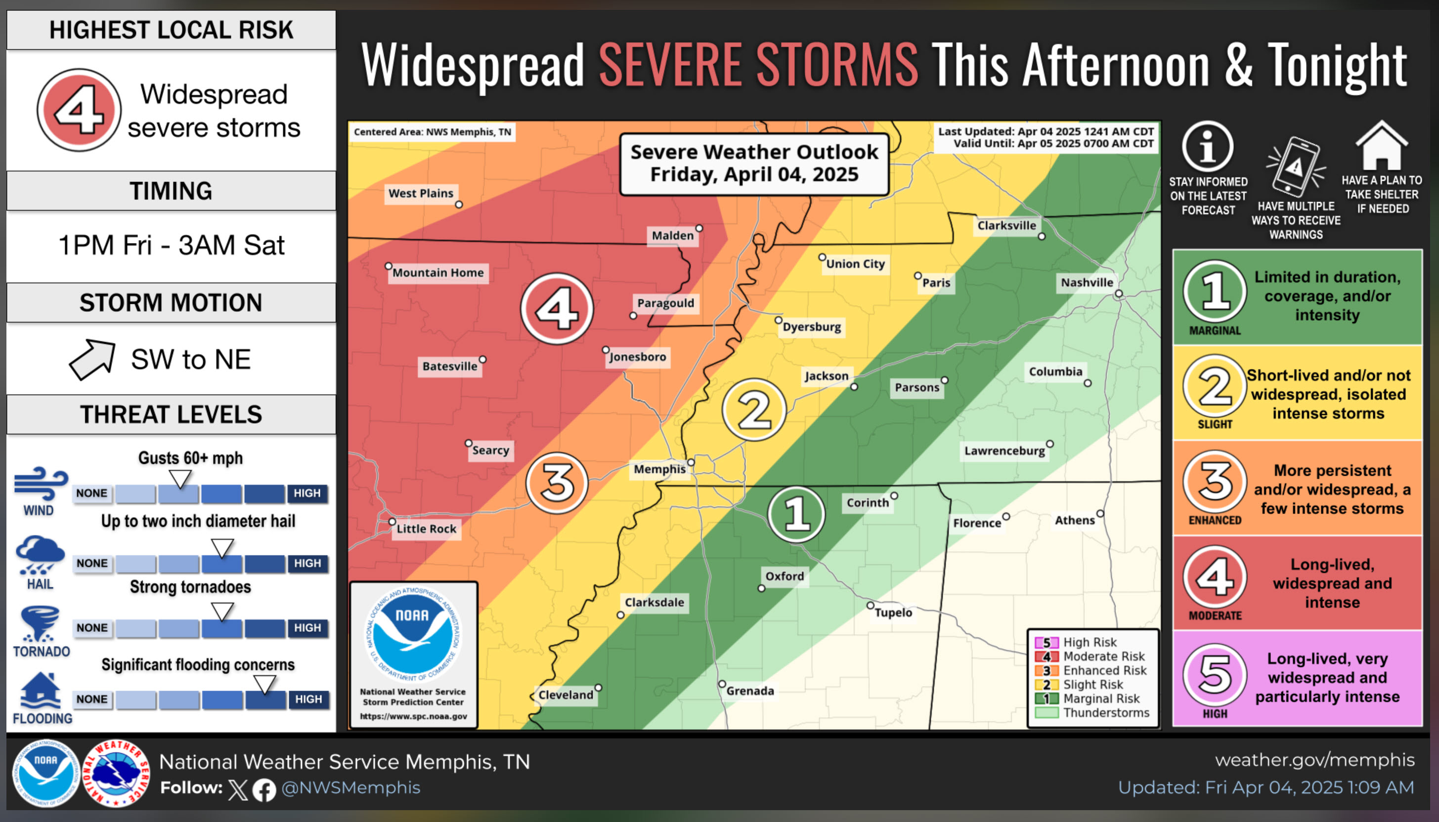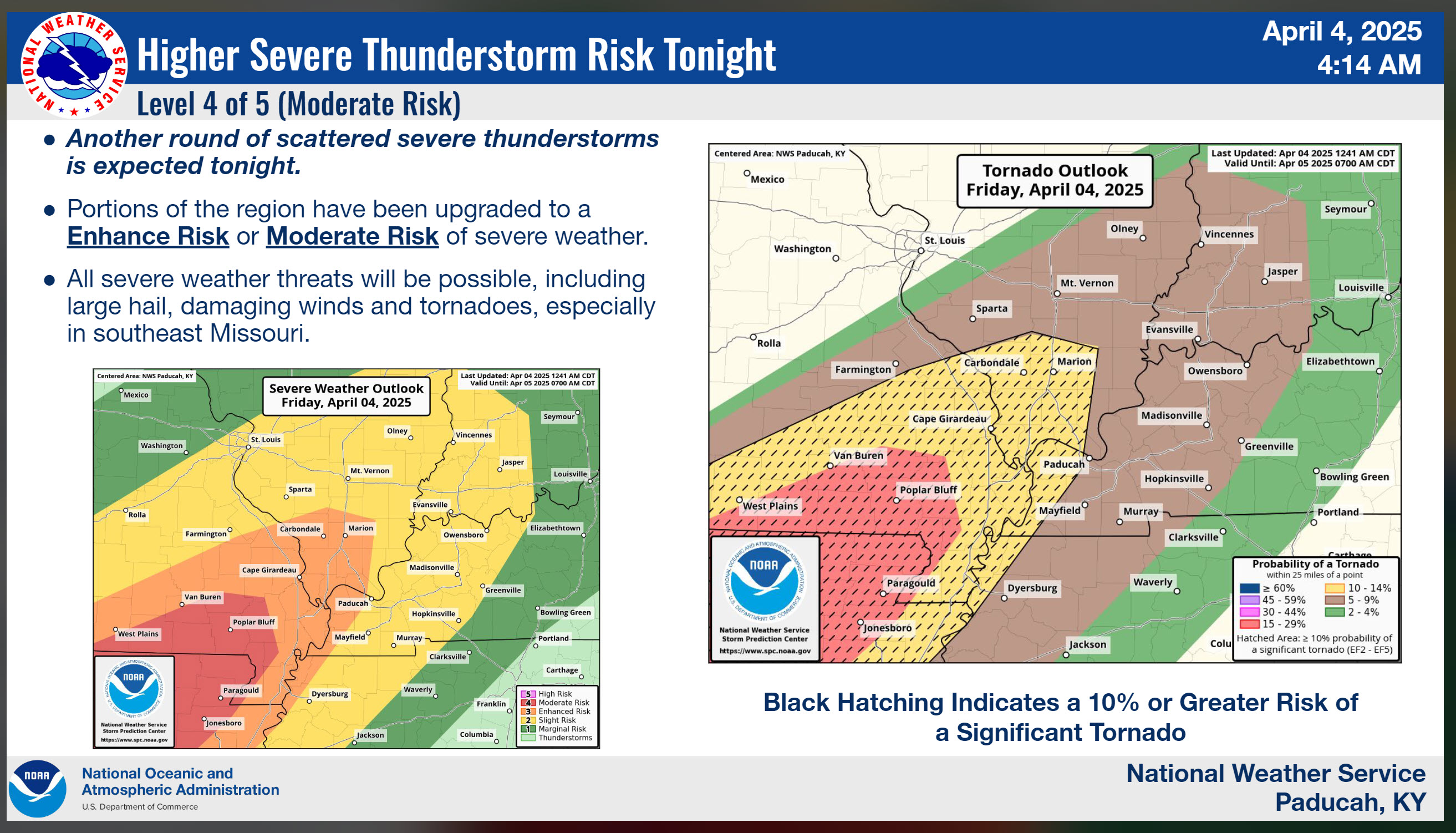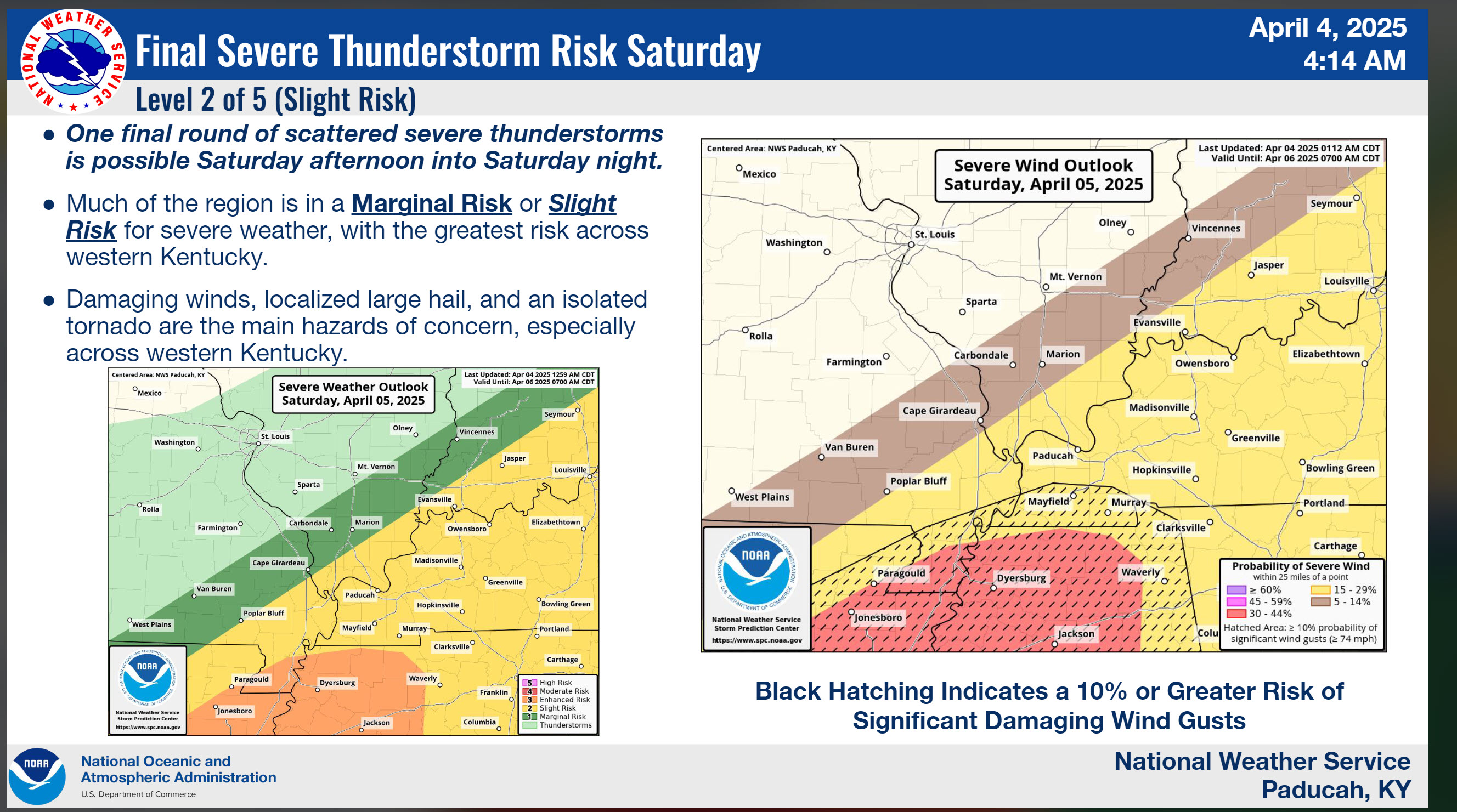 - Severe storms are likely later today and tonight. Another risk on Saturday. Monitor warnings, as always.