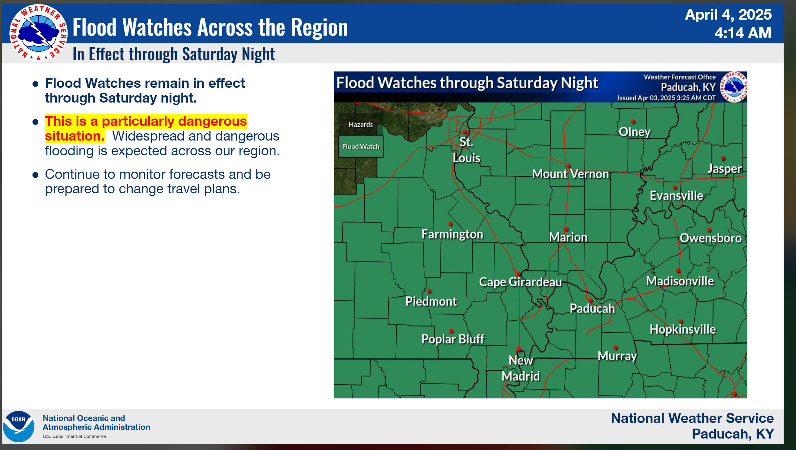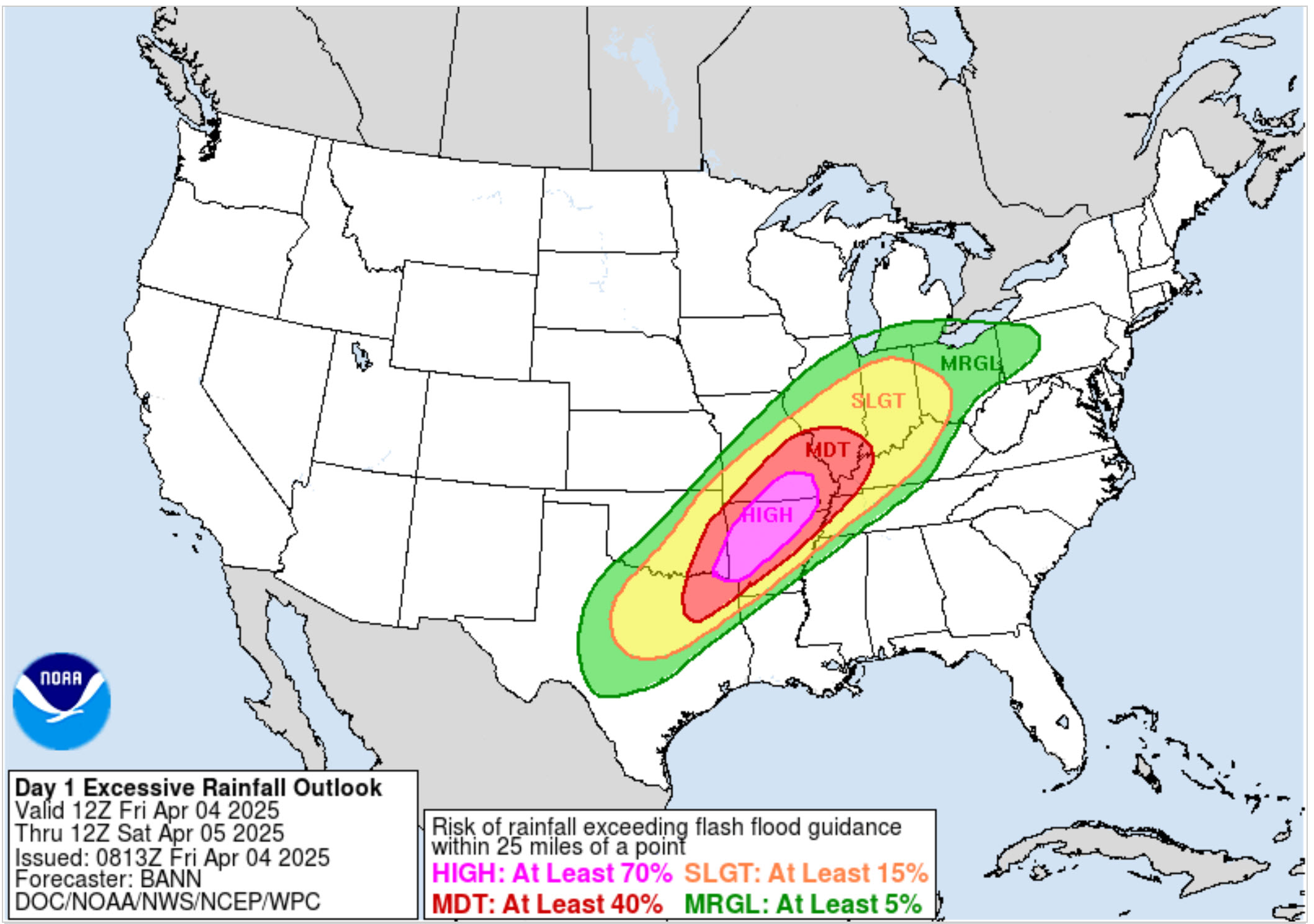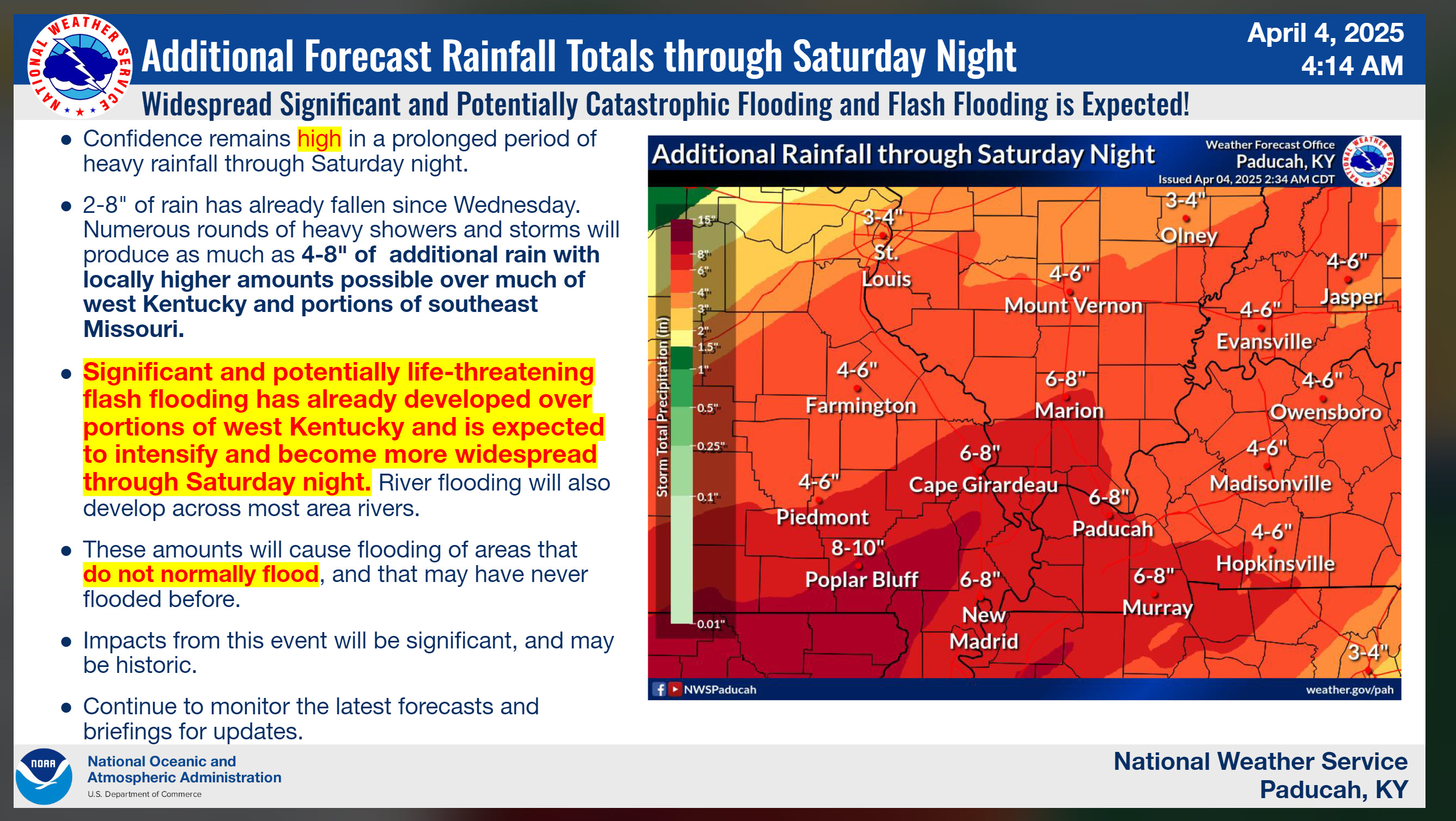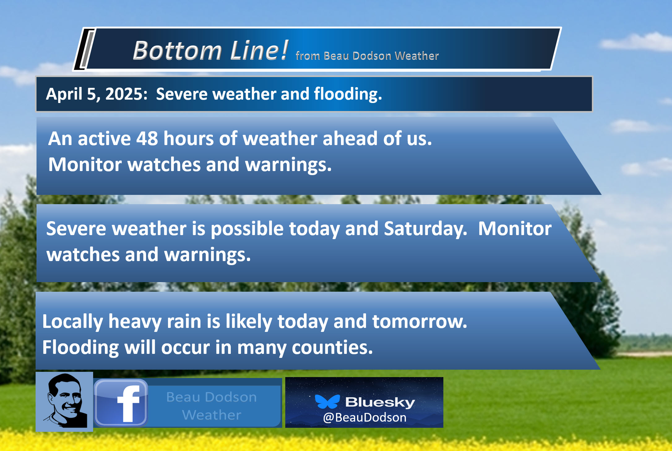 3. Is flash flooding in the forecast? YES. Significant flash flooding is expected. Significant river flooding is likely. Flash flooding is likely into Saturday. Locally, very heavy rain is anticipated. Some counties could exceed eight inches of rain in total. Monitor updates.