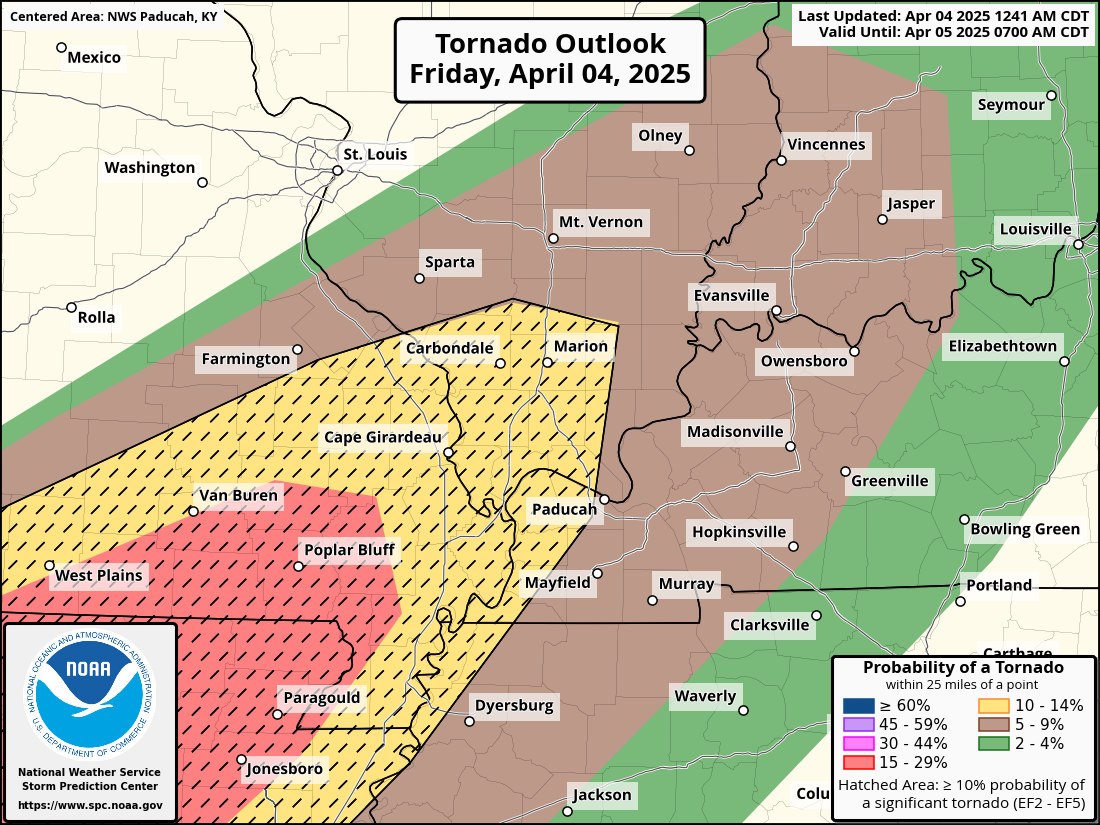 Tornado risk today and tonight. Hatched means EF2 or higher tornadoes.