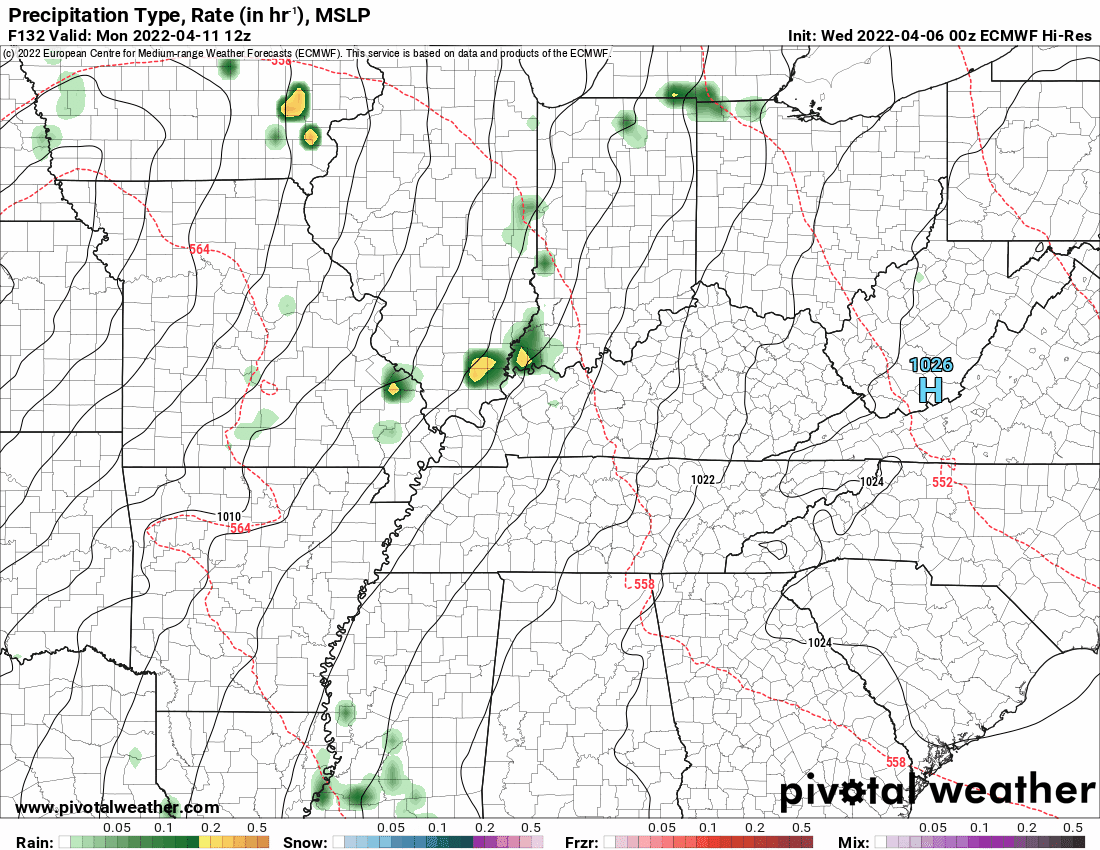 Temperature range: MO Bootheel 56° to 58° / SE MO 54° to 56° / I-64 Corridor of South IL 54° to 56° / South IL 54° to 56° / Northwest KY (near Indiana border) 54° to 56° / West KY 54° to 56° / NW TN 54° to 58°