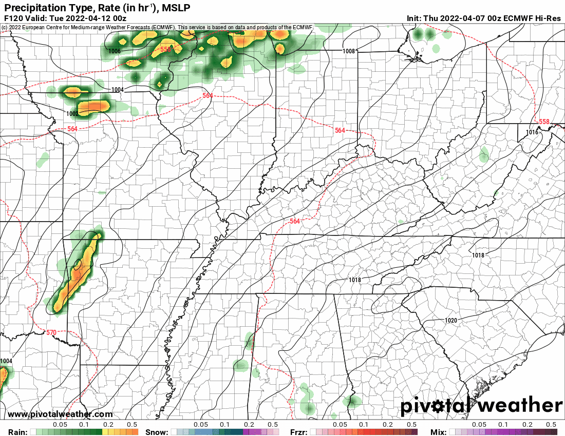 Temperature range: MO Bootheel 56° to 58° / SE MO 54° to 56° / I-64 Corridor of South IL 54° to 56° / South IL 54° to 56° / Northwest KY (near Indiana border) 54° to 56° / West KY 54° to 56° / NW TN 54° to 58°