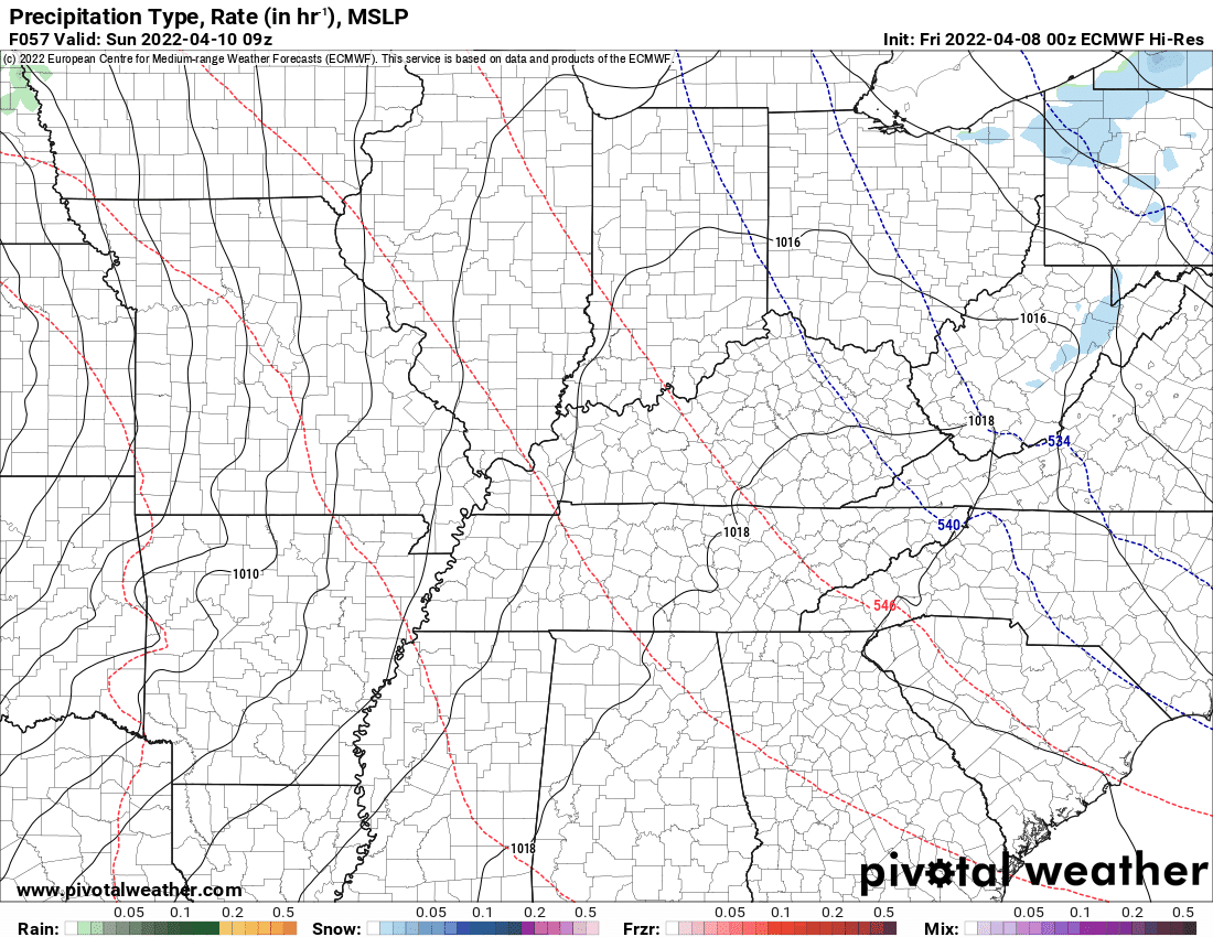 Temperature range: MO Bootheel 54° to 56° / SE MO 52° to 54° / I-64 Corridor of South IL 52° to 54° / South IL 52° to 54° / Northwest KY (near Indiana border) 52° to 54° / West KY 53° to 56° / NW TN 54° to 56°