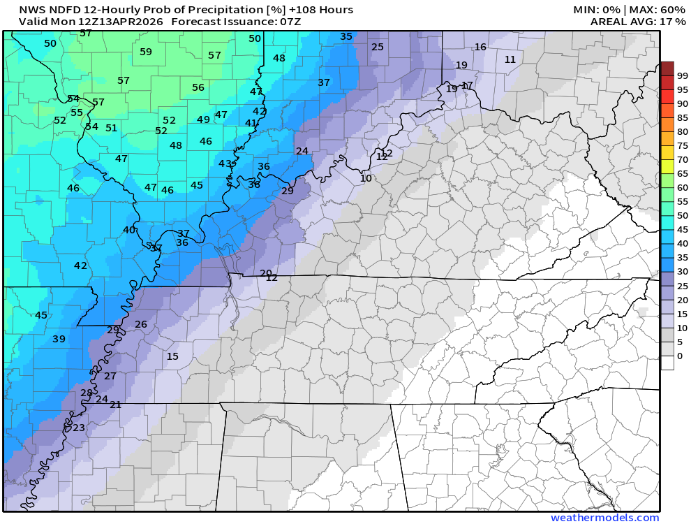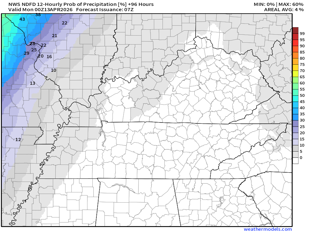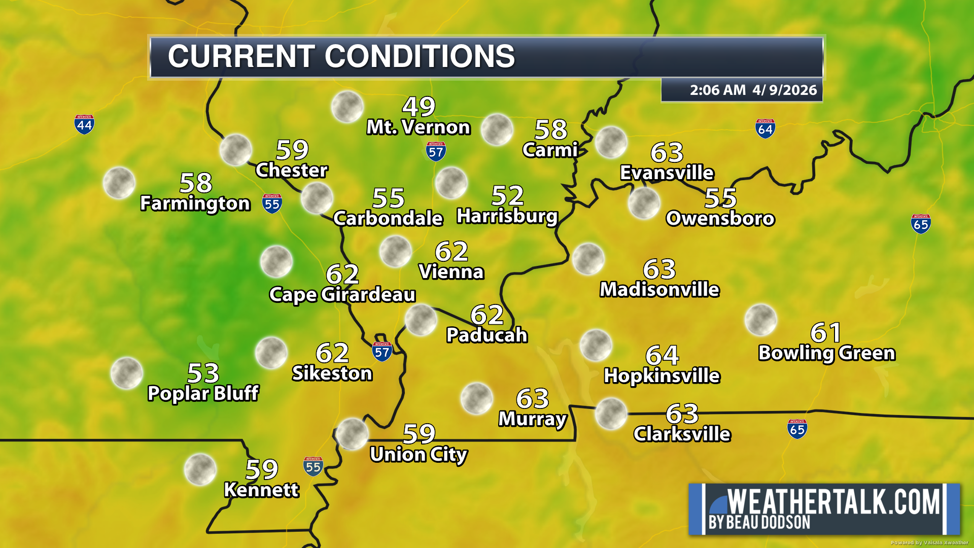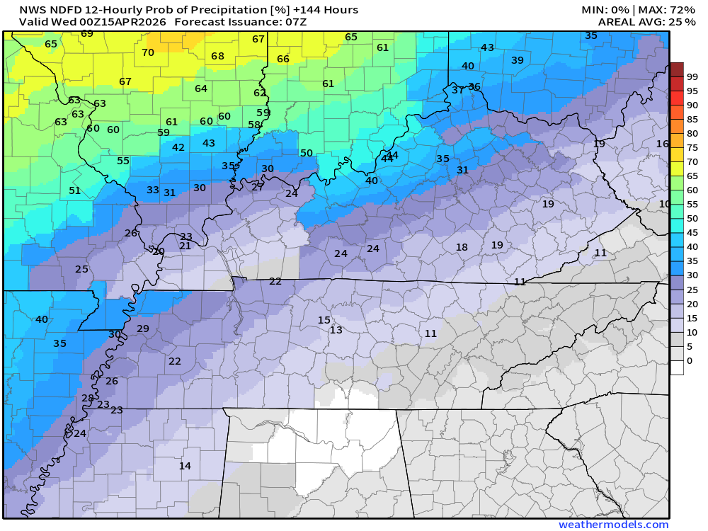 - A few showers and thunderstorms across mainly southeast Missouri and southern Illinois from Friday into Monday morning. The chances are lower in Kentucky and Tennessee.