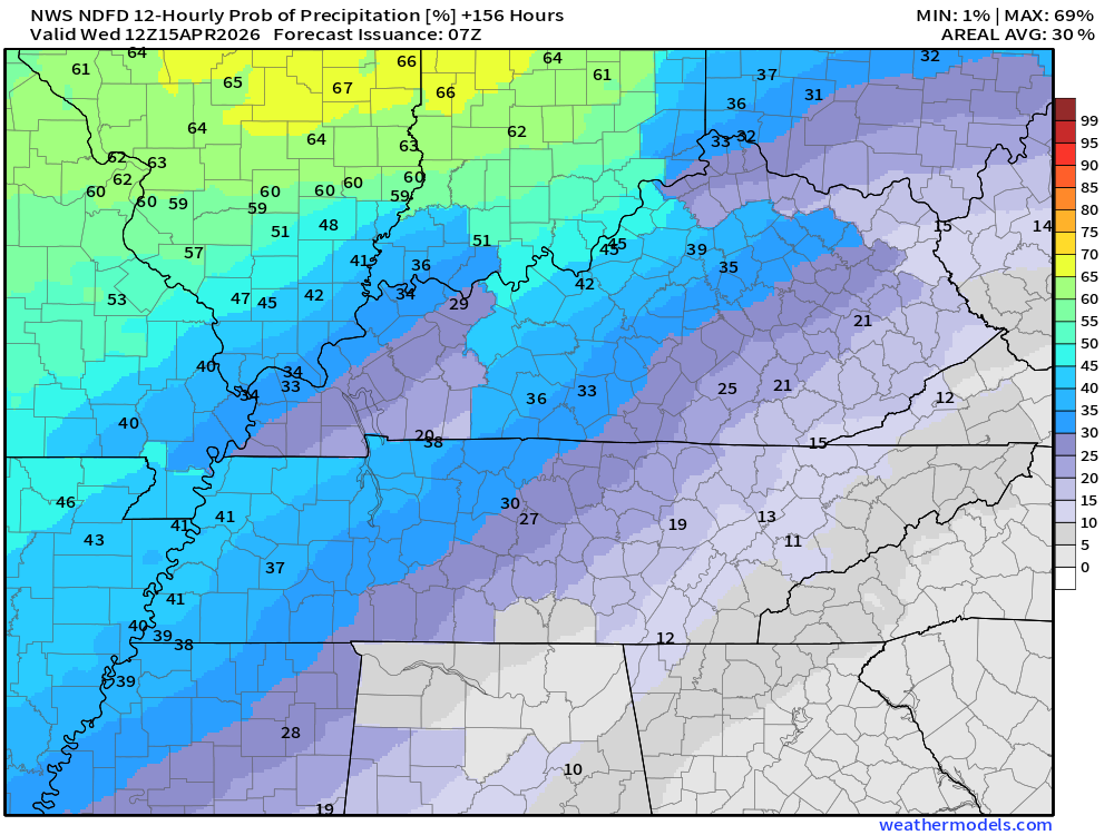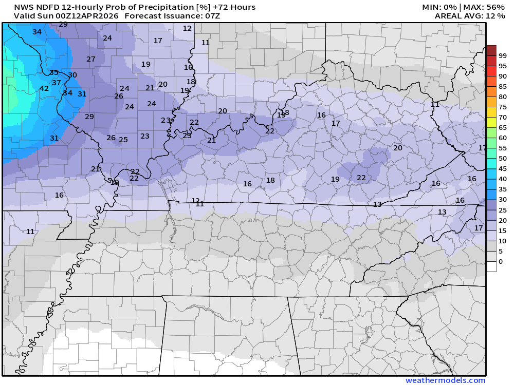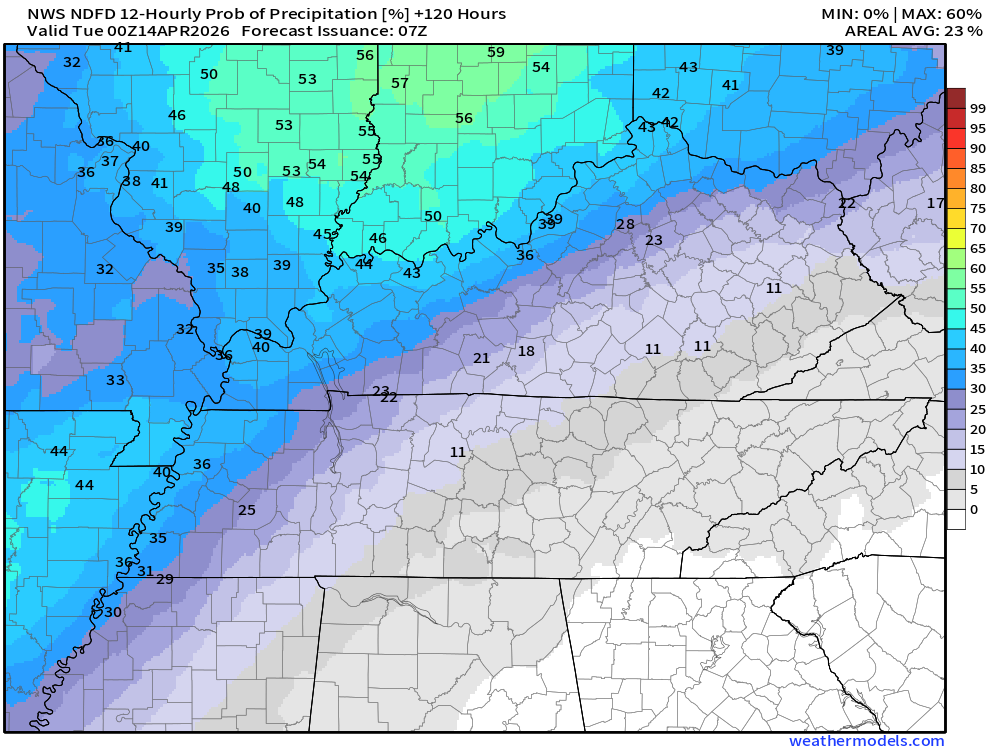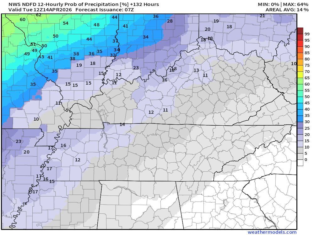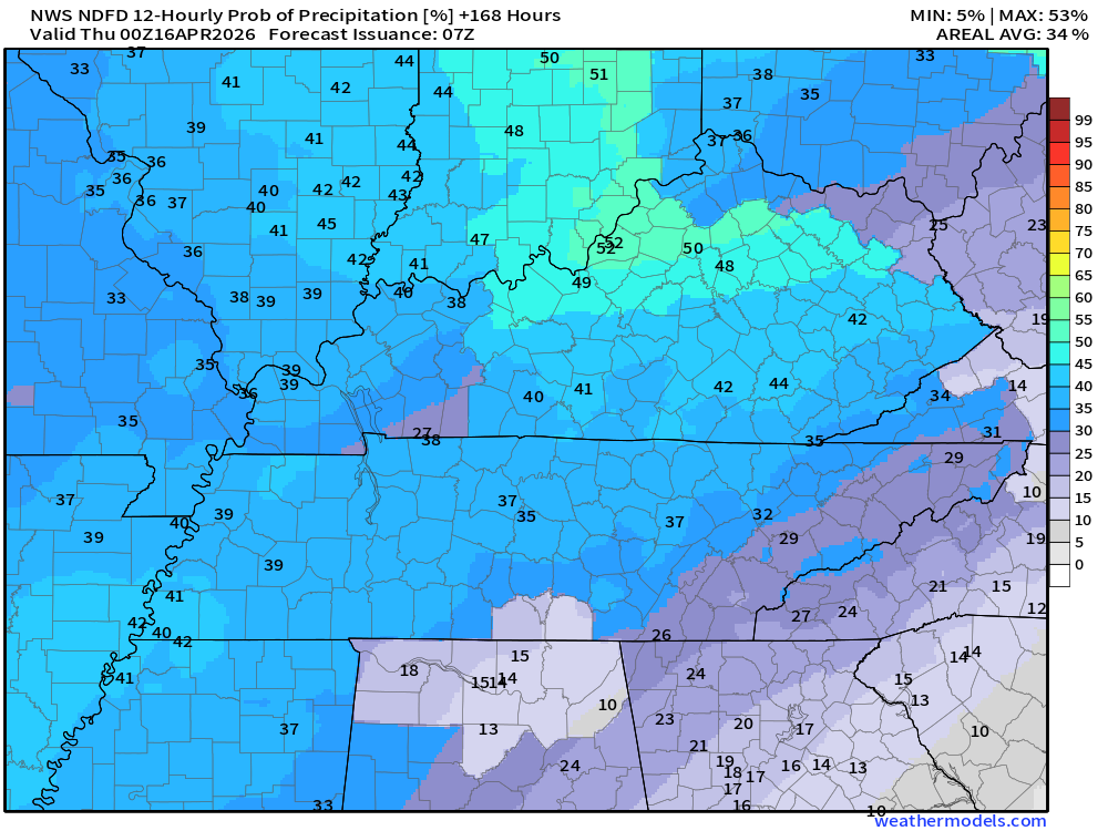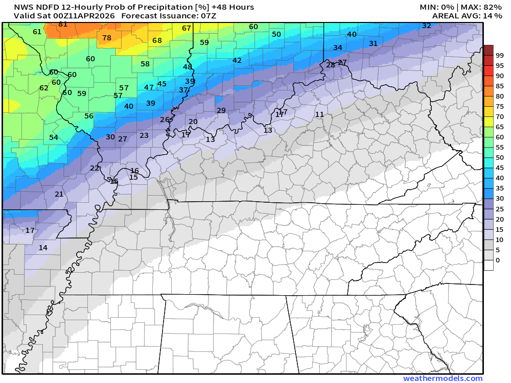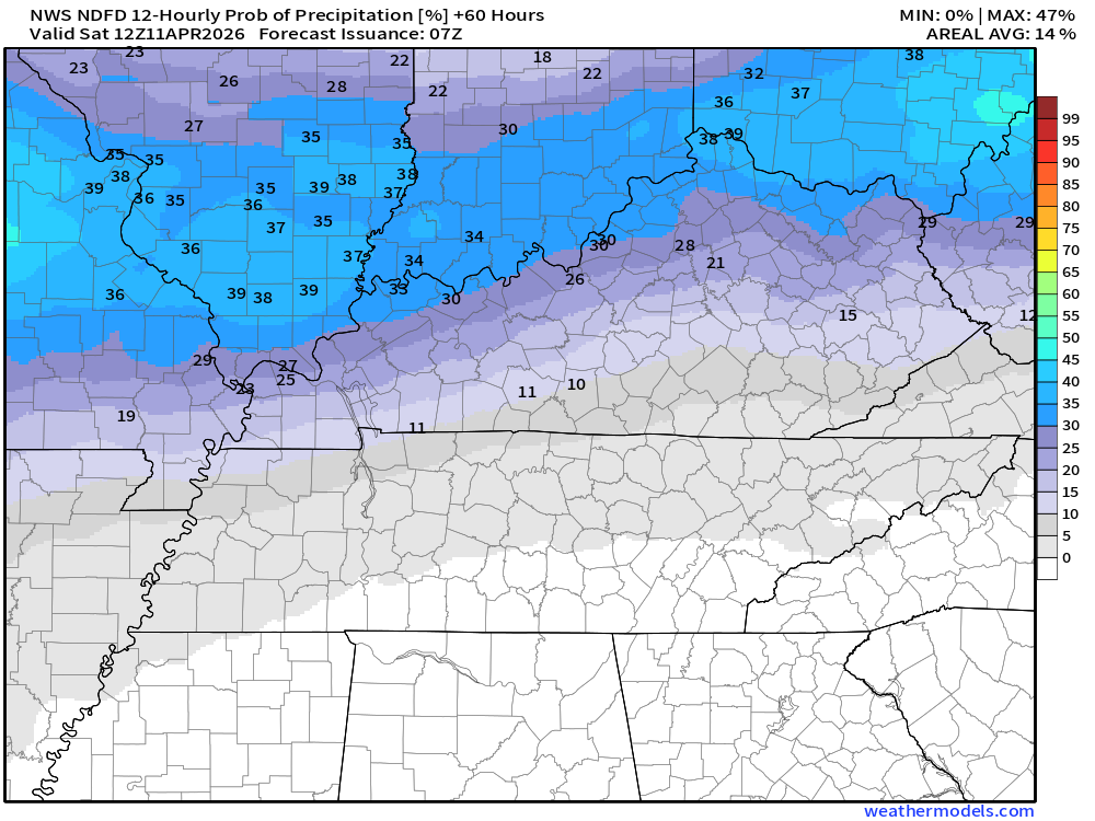 1. Is lightning in the forecast? POSSIBLE. I will monitor this coming weekend and next week. I do have scattered showers and thunderstorms in the forecast this weekend. Mainly over southeast Missouri and southern Illinois. Lower chances over Kentucky/Tennessee. See the rain probability graphics below.