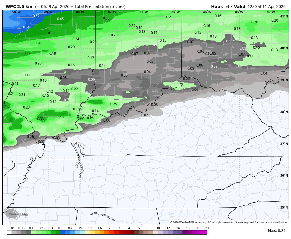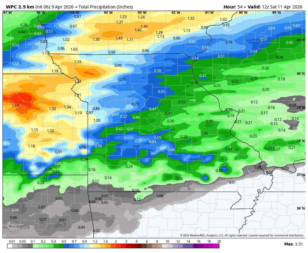 Here are the expected rain totals from Friday through early Saturday morning. As you can see, it is centered over Missouri and Illinois. Lower totals south and east of the Ohio River.