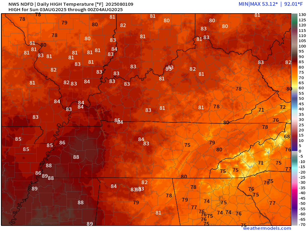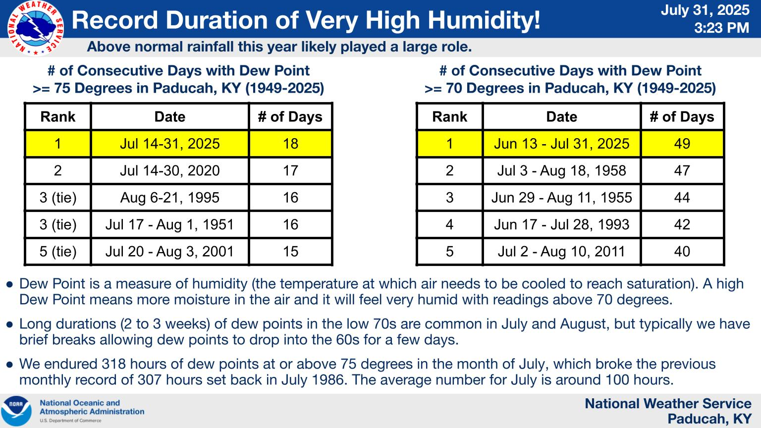 We have reached the end of the longest stretch of continuously high humidity that Paducah has witnessed in the past 75 years. The number of hours at oppressive levels (dew points 75+) has exceeded 300% of normal for the month of July.