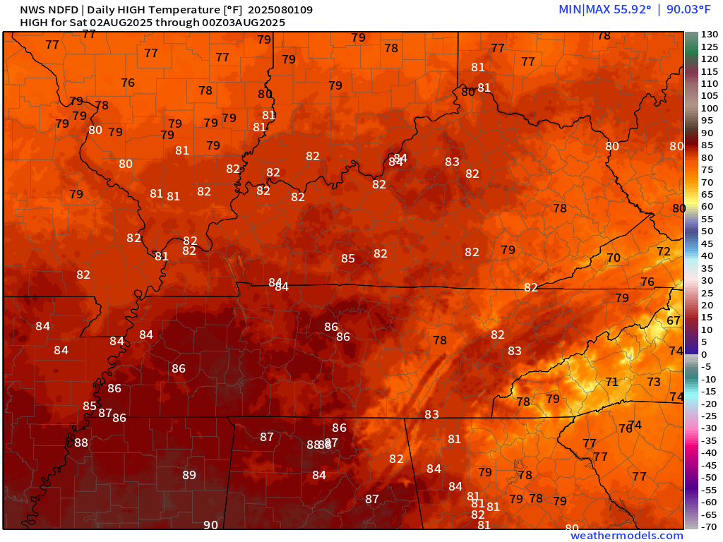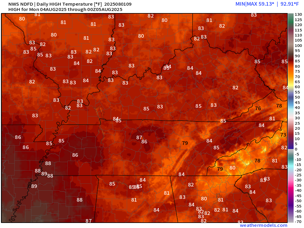 It will be a bit warmer by Monday and Tuesday.  A bit more humid, as well.  I do not believe we will return to the extreme numbers we witnessed this past week.  But, it could be humid again.  Typical summer/August conditions for our region.