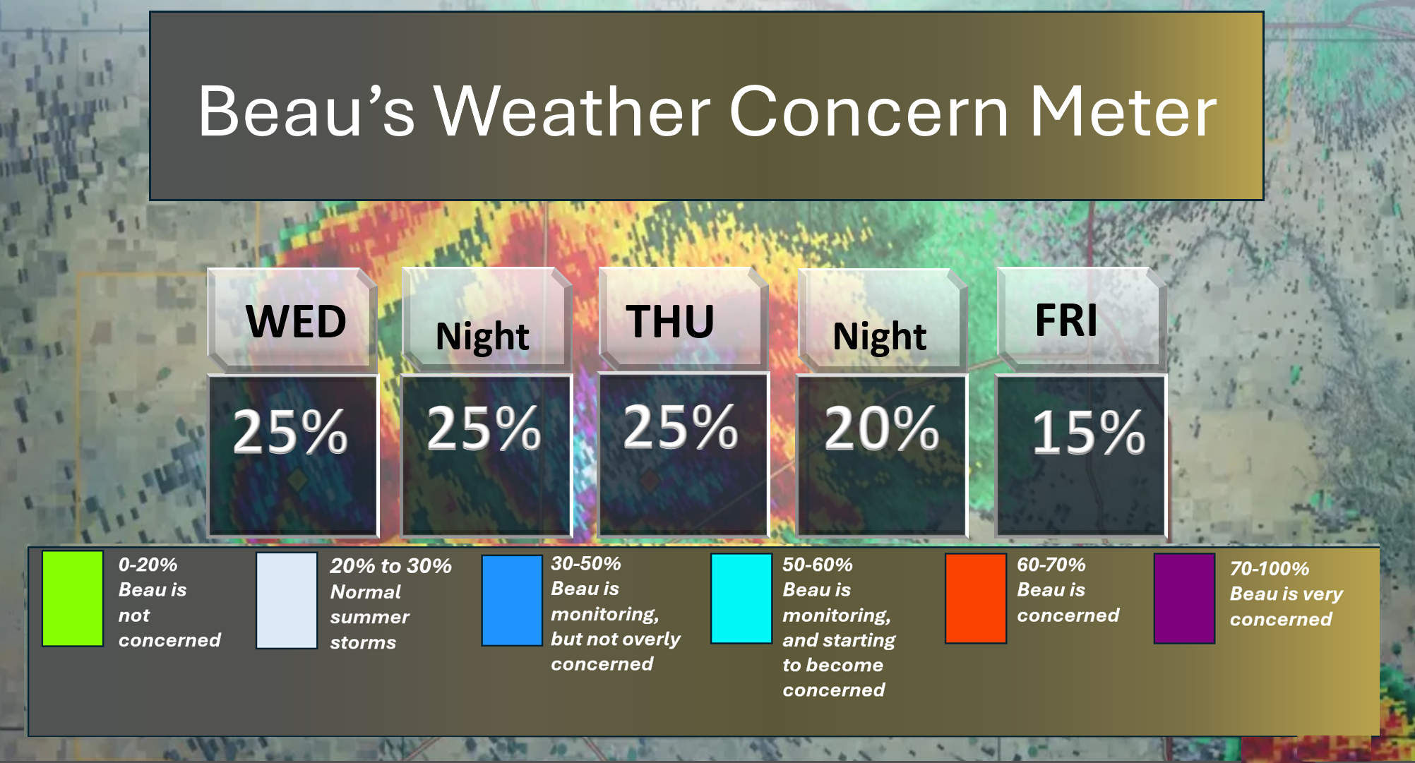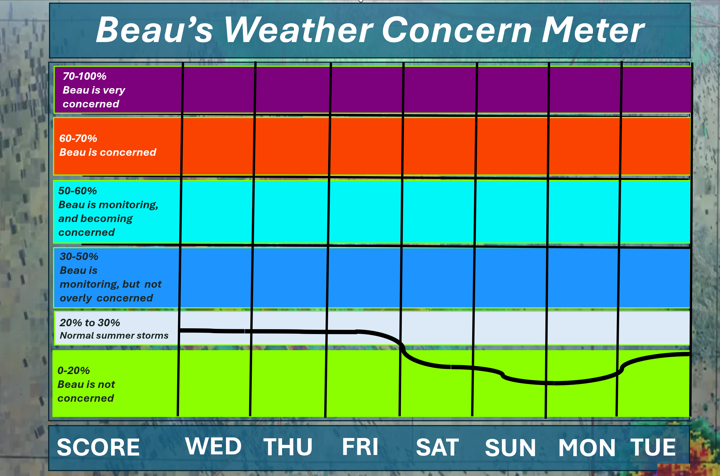 Here is the extended concern meter. This takes us through next Tuesday. Extreme weather is not anticipated. It will be hot this weekend.