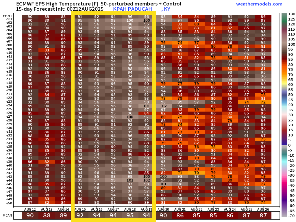 You can see this weekend’s heat on the EC ensembles high temperature matrix. You can also see that cold front next week.