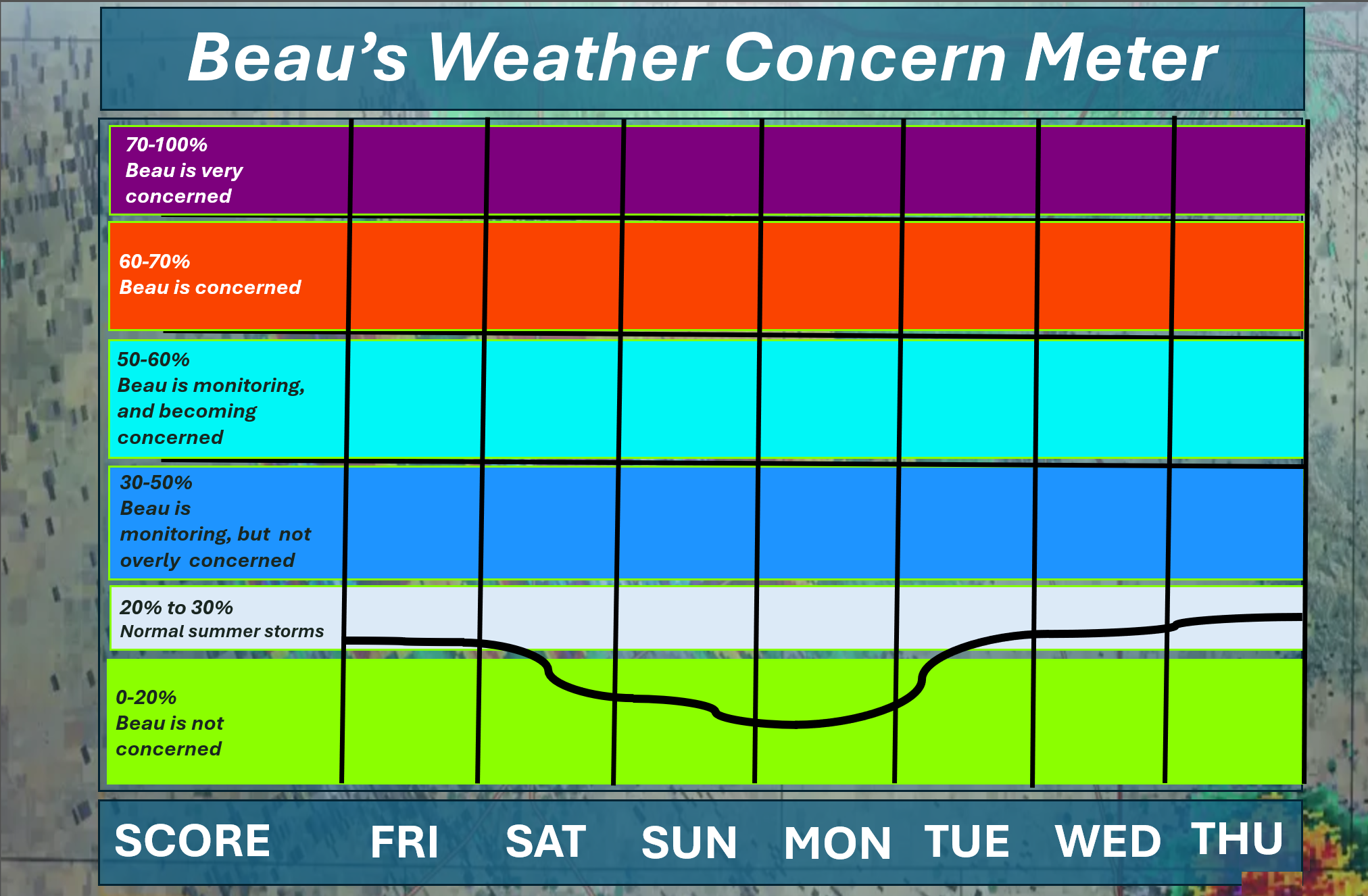Here is the short-range concern meter.  An isolated thunderstorm is possible today; otherwise, we are in the green.
