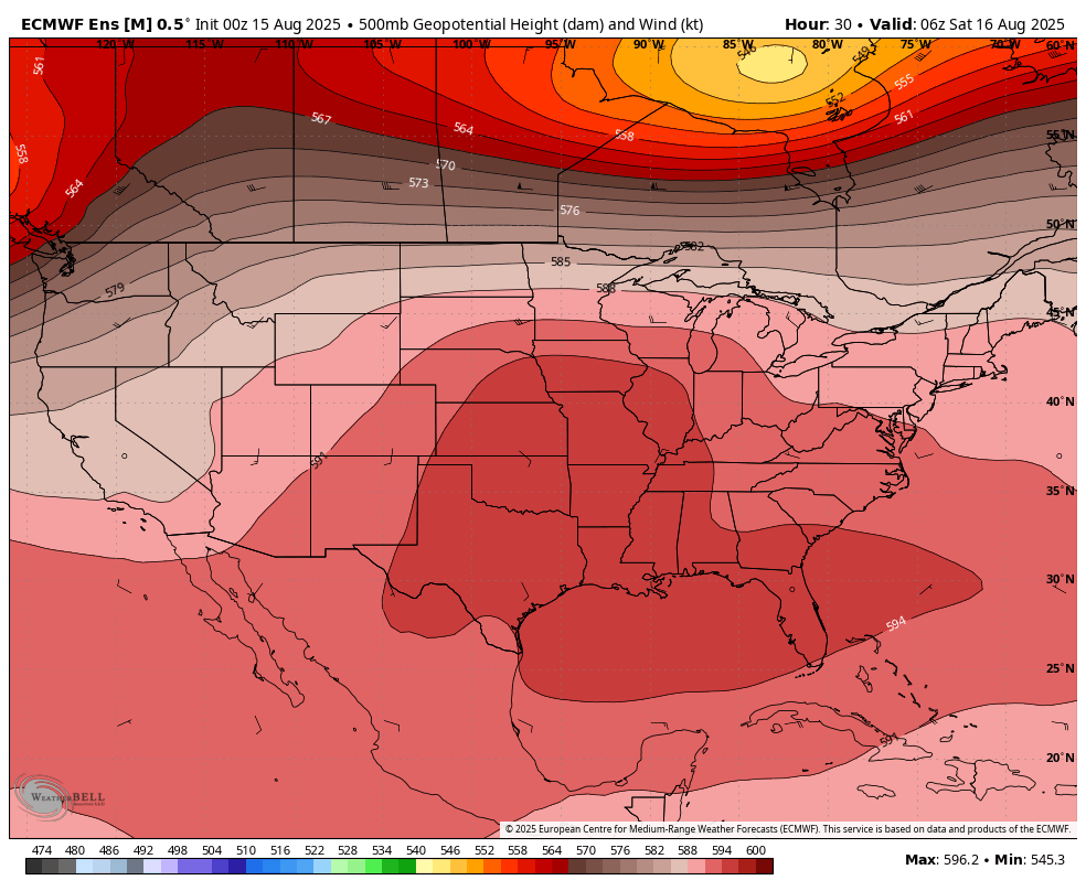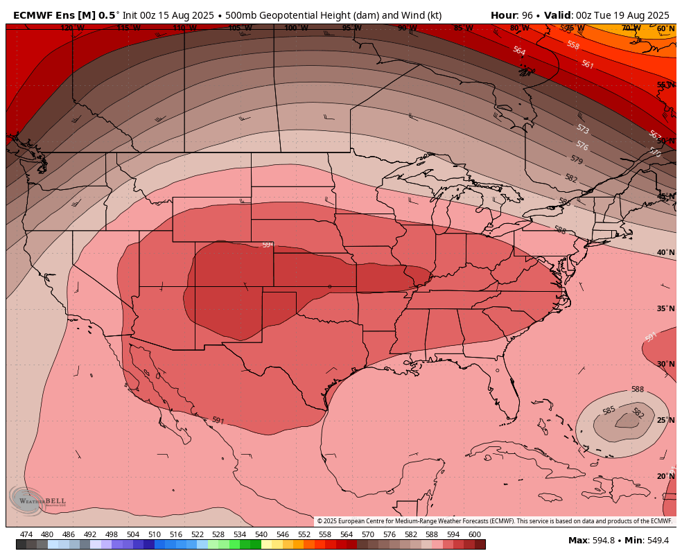 You can see that ridge on these 500 mb maps.  Looking aloft.  That dark red is the ridge.  During the summer, a ridge means hot weather.