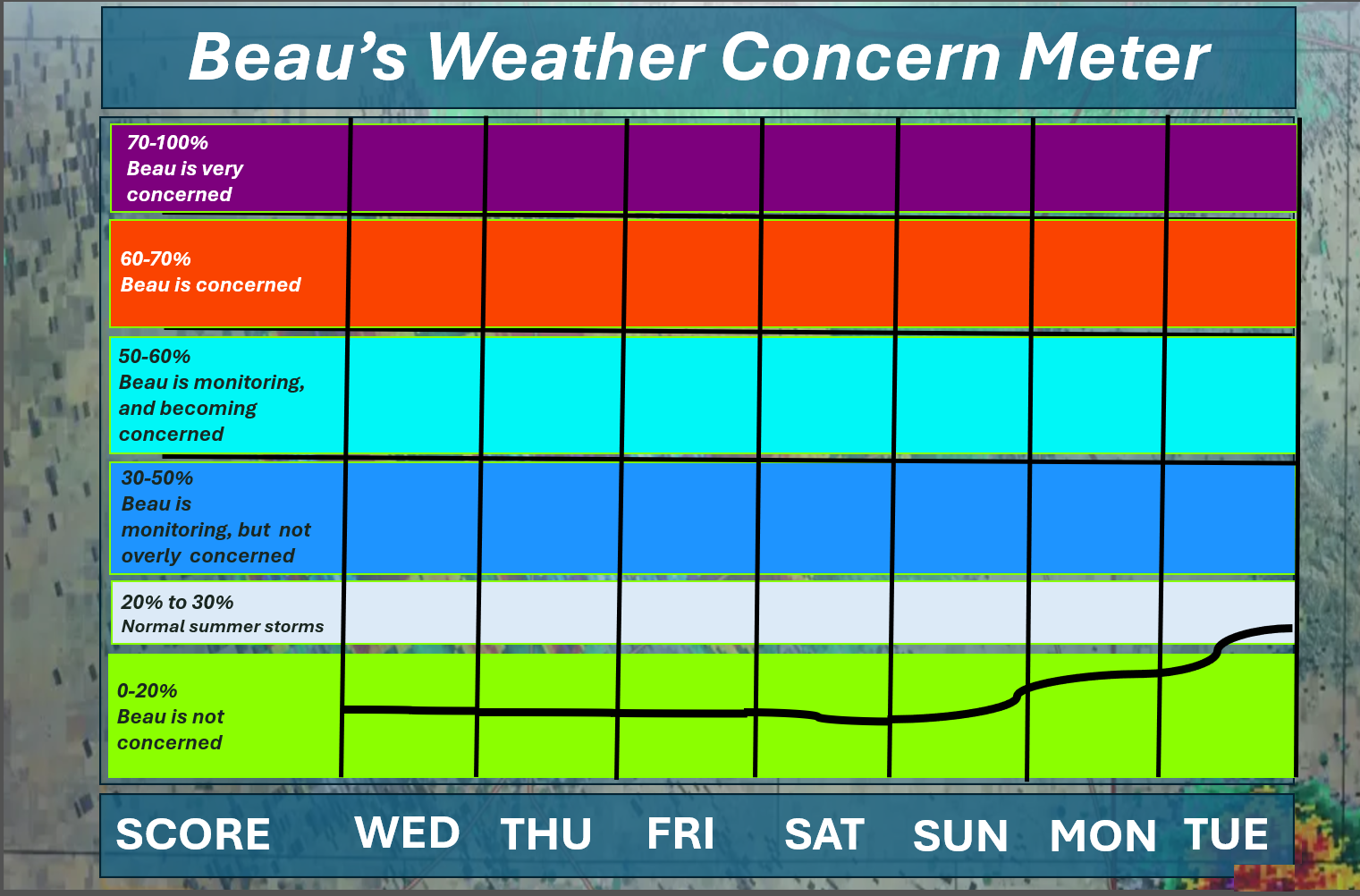 We are in the green through Monday. I will keep an eye on next Tuesday and Wednesday. Perhaps some showers and thunderstorms. At this time, severe weather is not anticipated.