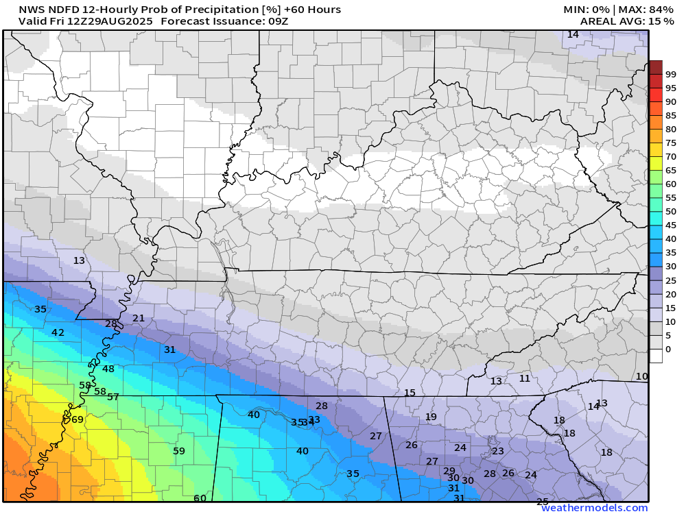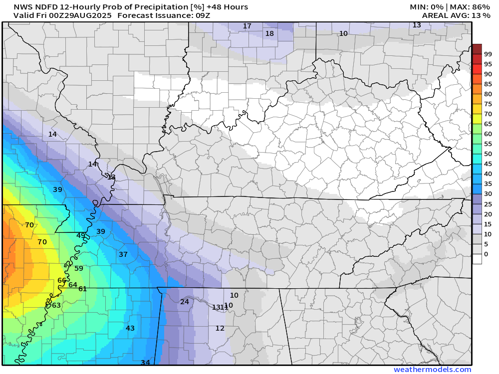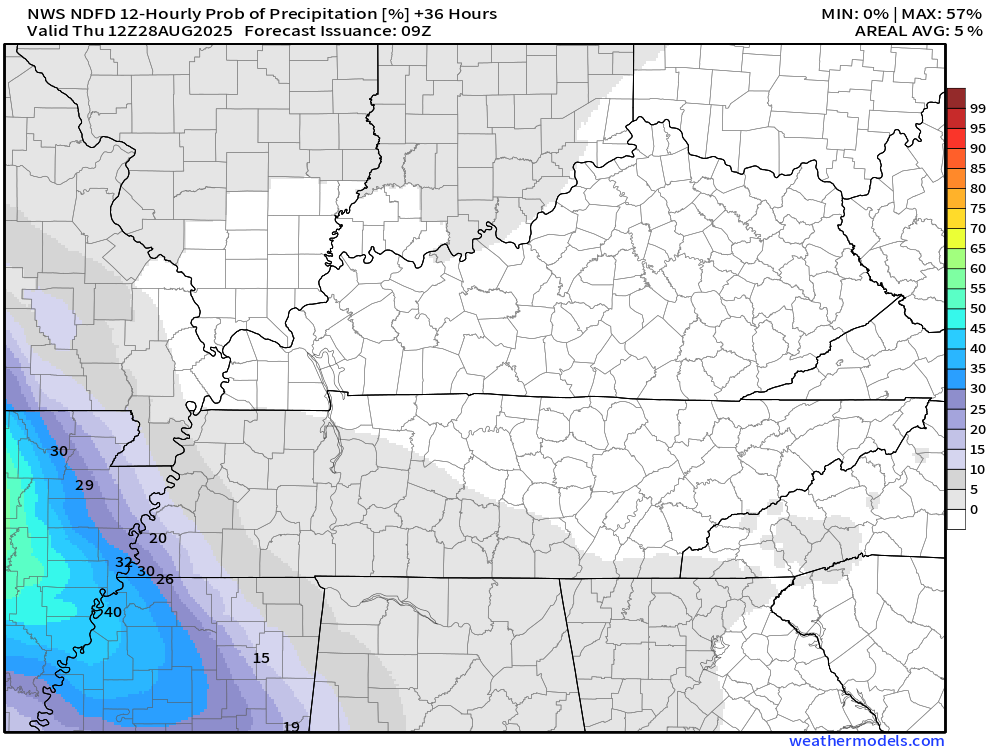 - Scattered showers are possible tonight and Thursday. Mainly our far southwestern counties. See graphics.