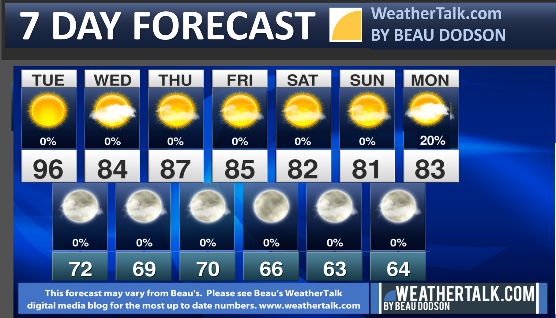 I am watching several frontal boundaries Sunday night into next week. That will bring a chance of showers and thunderstorms. For now, I added in low-end precipitation chances, but I will need to monitor trends.