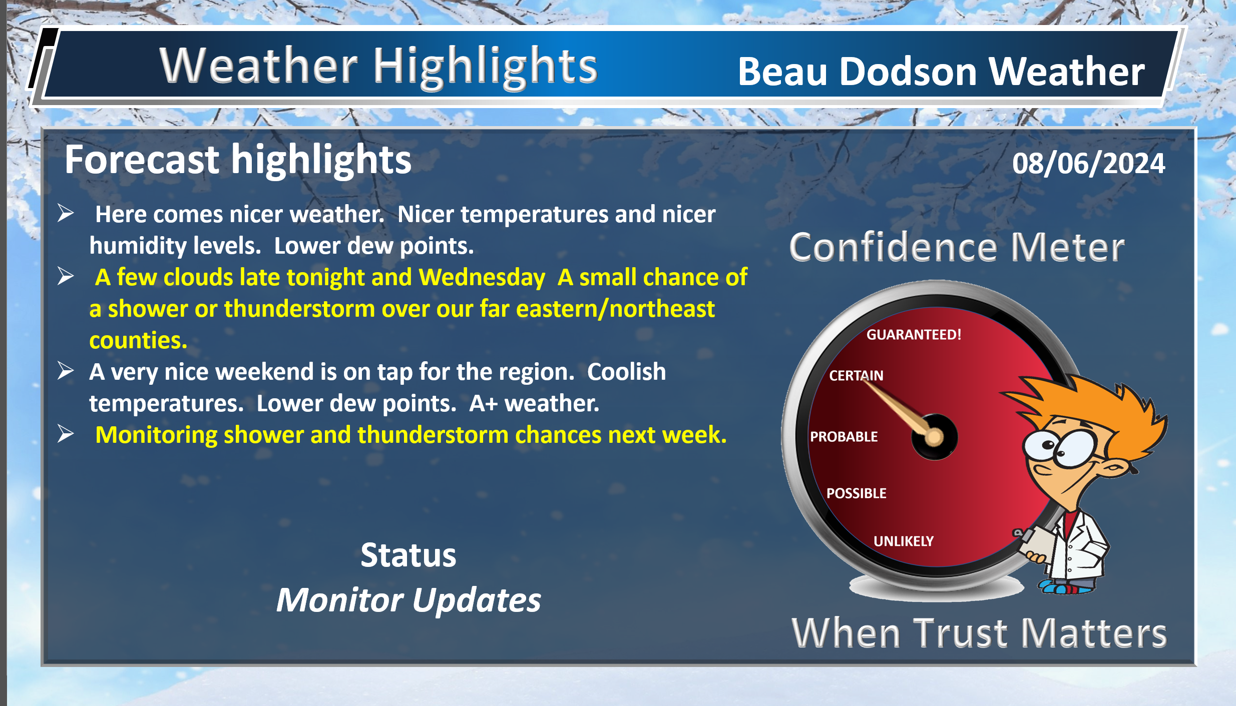 Tuesday Night Forecast: Increasing clouds. A slight chance of showers and thunderstorms over our northeast counties.