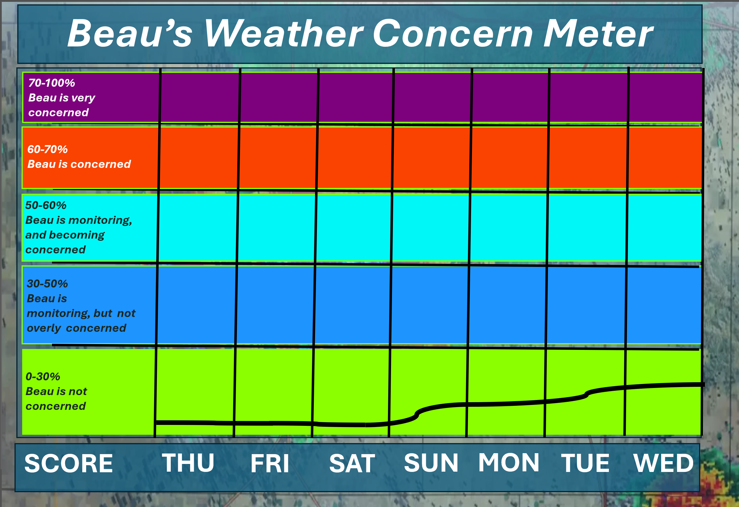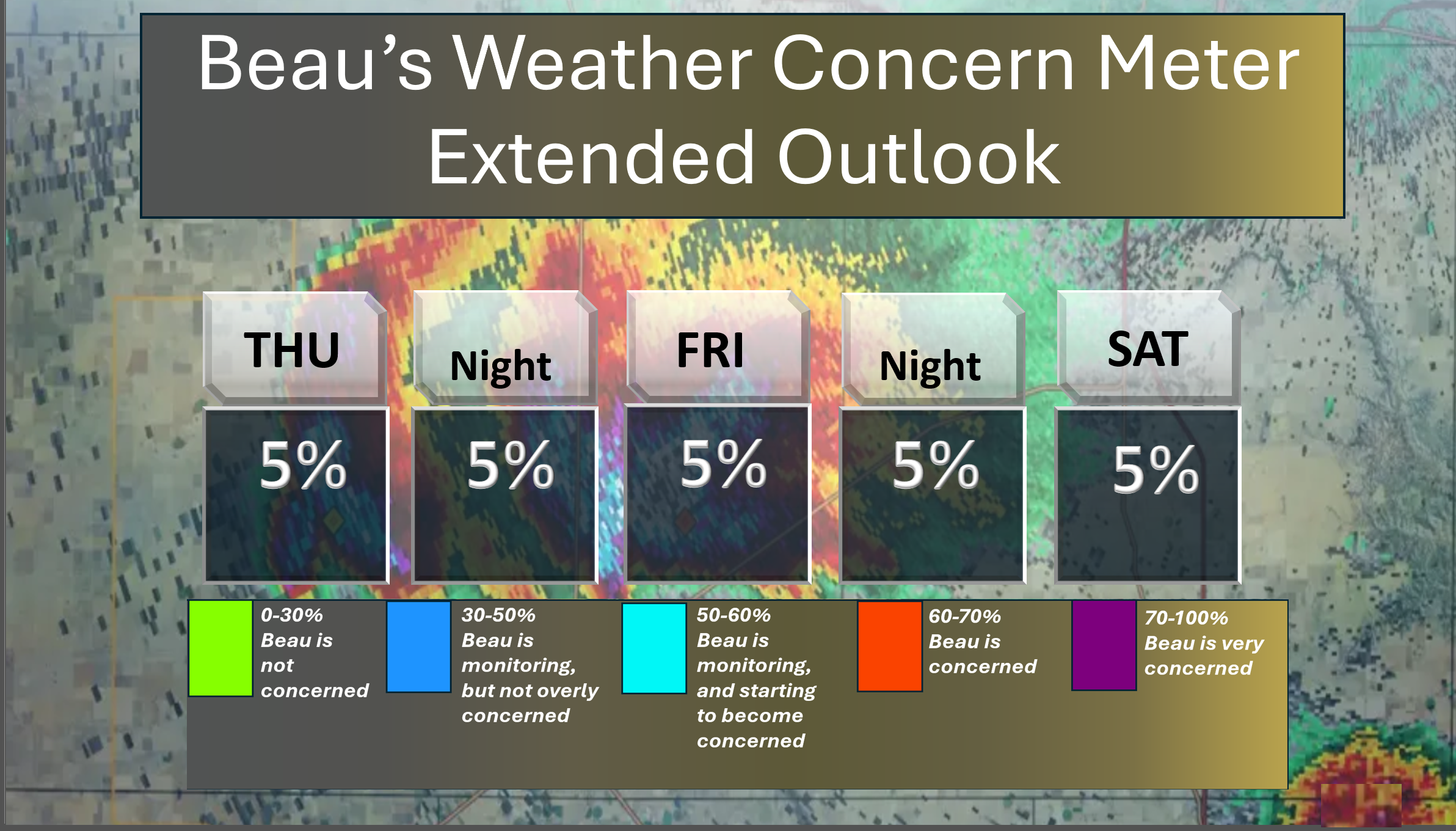 Here is the extended concern meter outlook.  This takes us through next Wednesday.  Extreme weather is not anticipated.