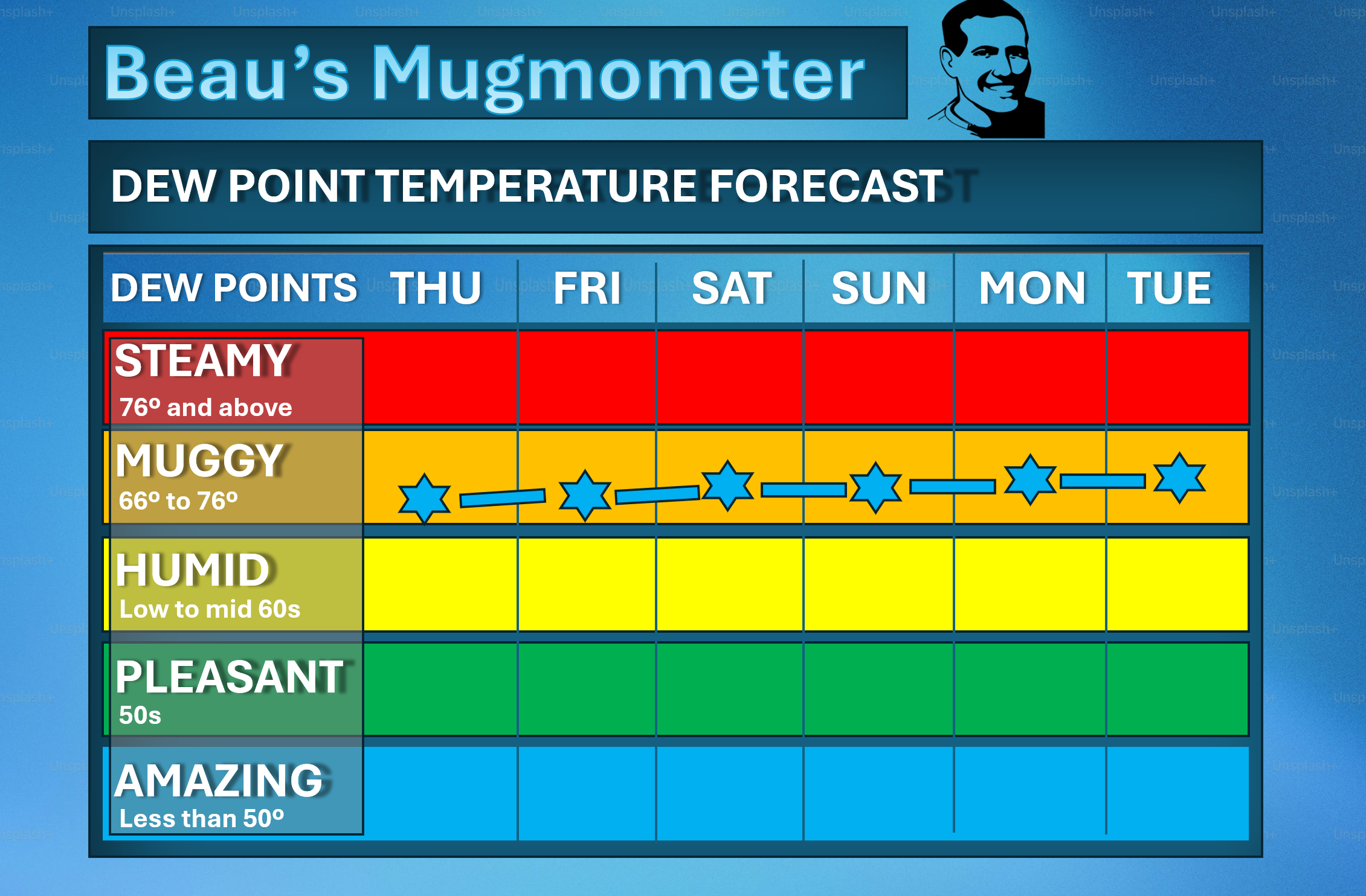 Remember, dew point is what controls how humid it feels outside.  It will be a bit more humid/sticky as we move through the week, but nothing extreme.