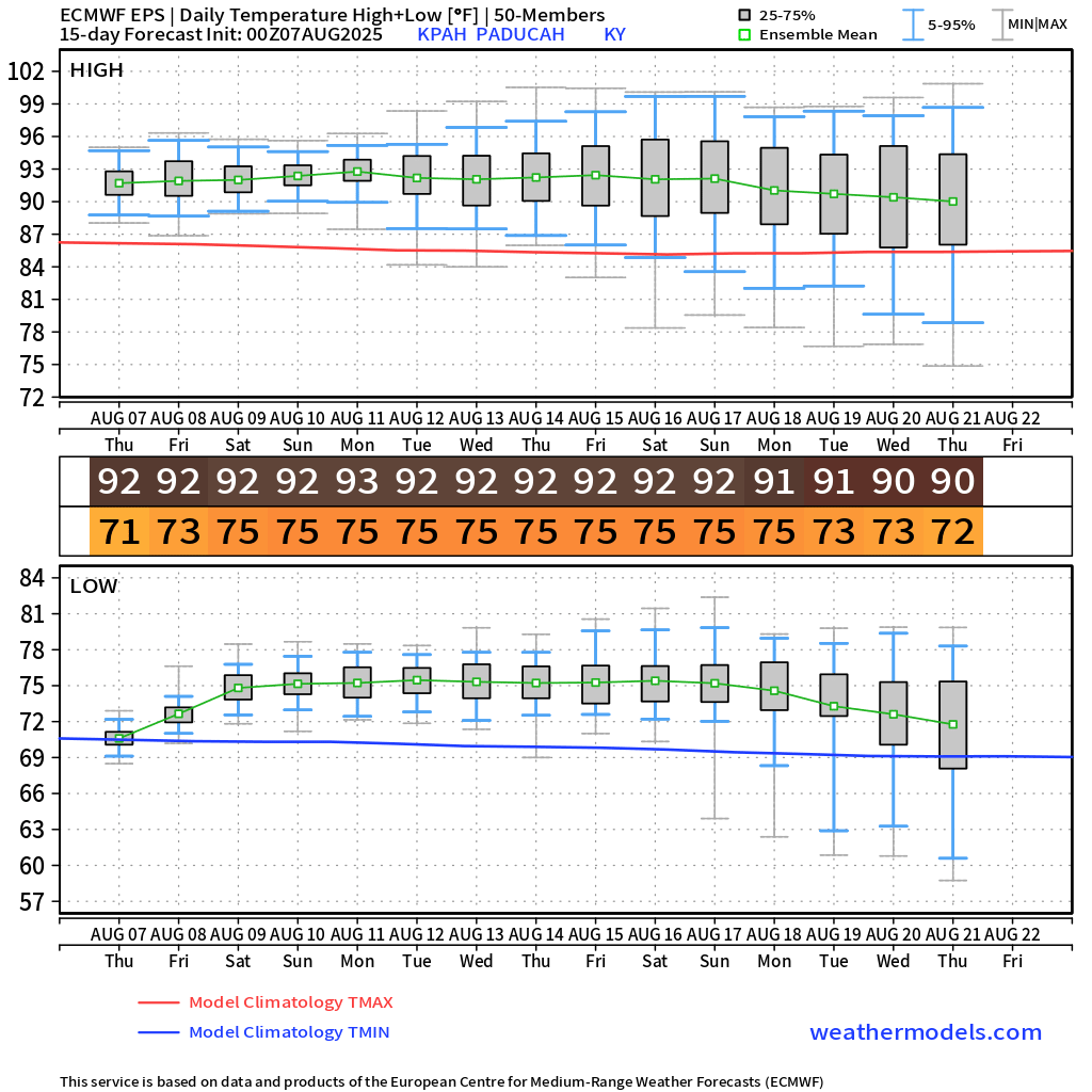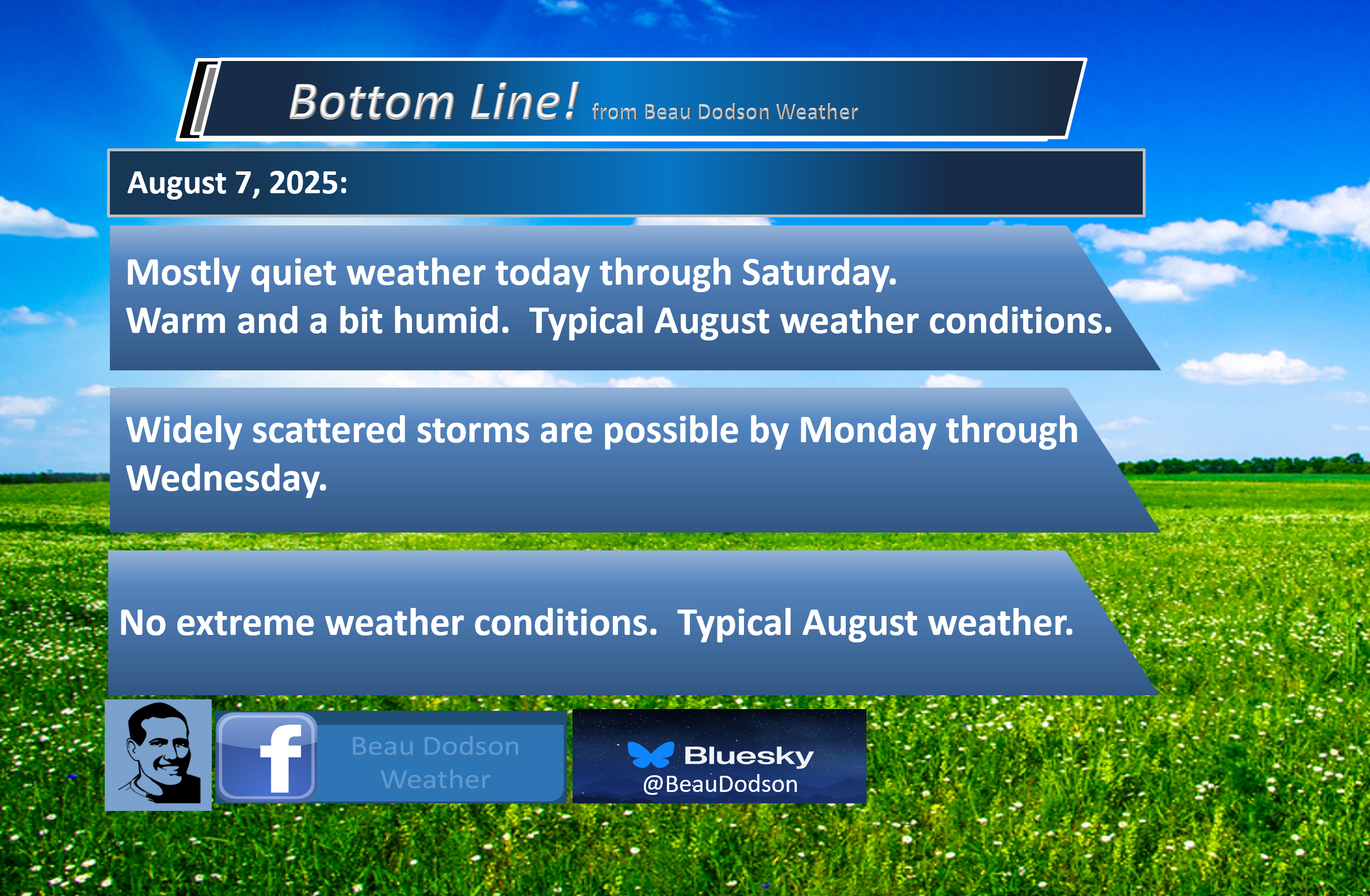 •   More warm and humid weather ahead.  Typical August weather.  No extremes.