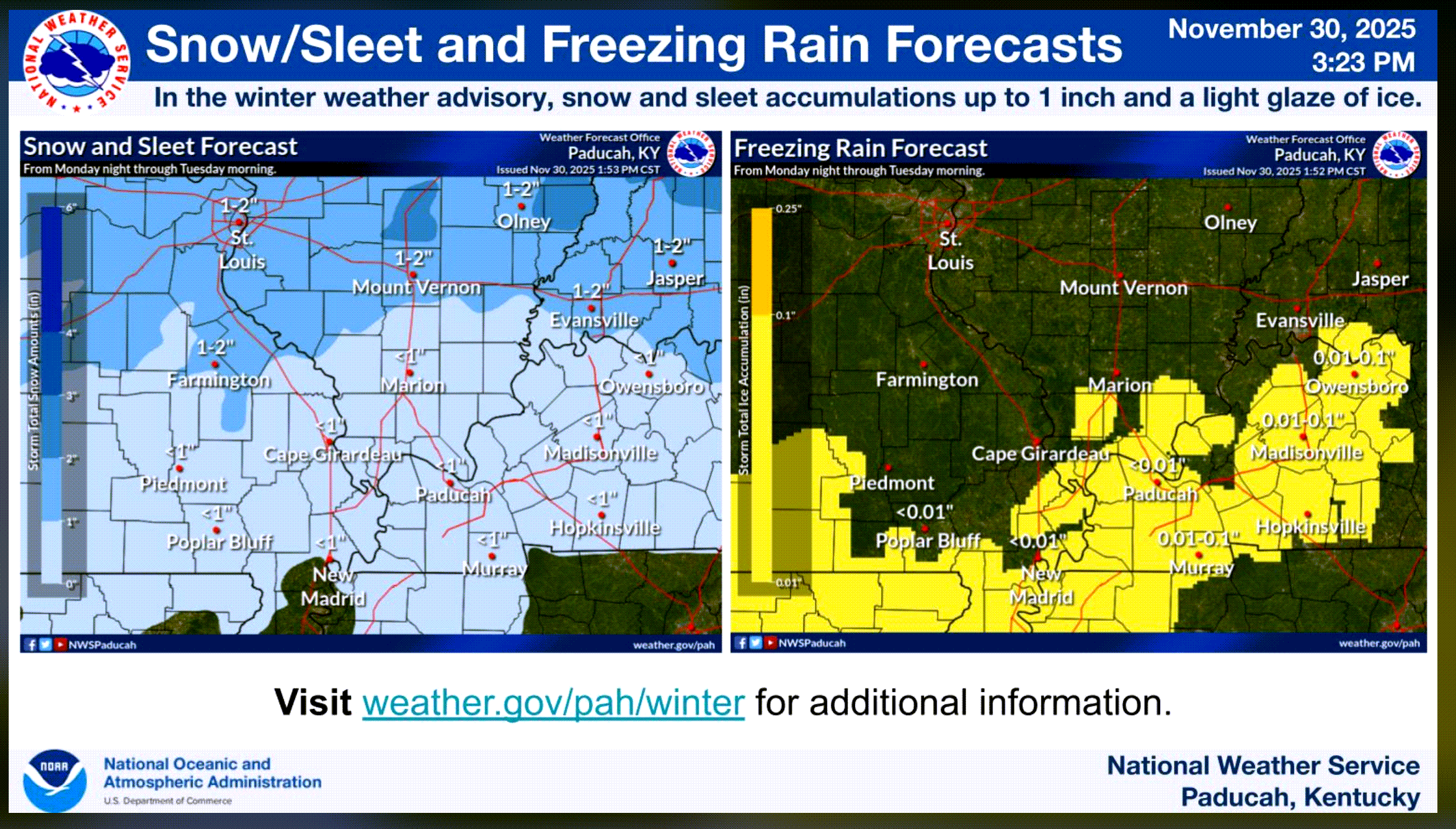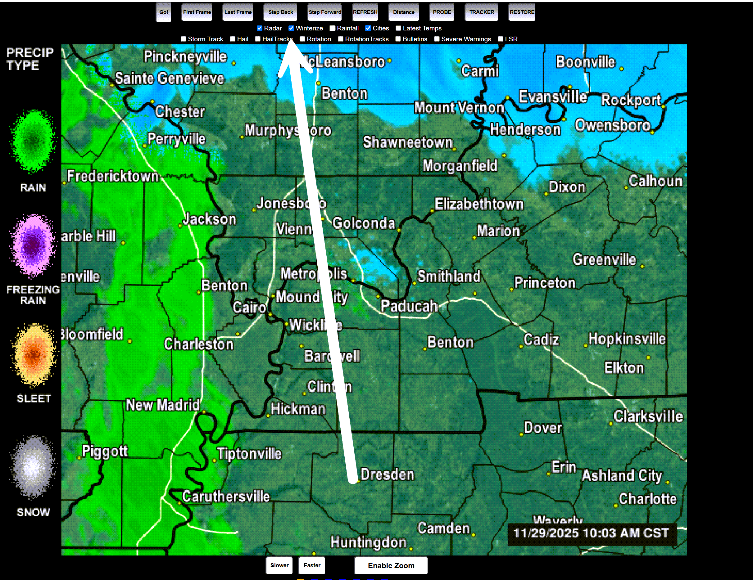 Snow has arrived in St Louis. Portions of southeast Missouri and northern portions of southern Illinois are reporting snow, as well.