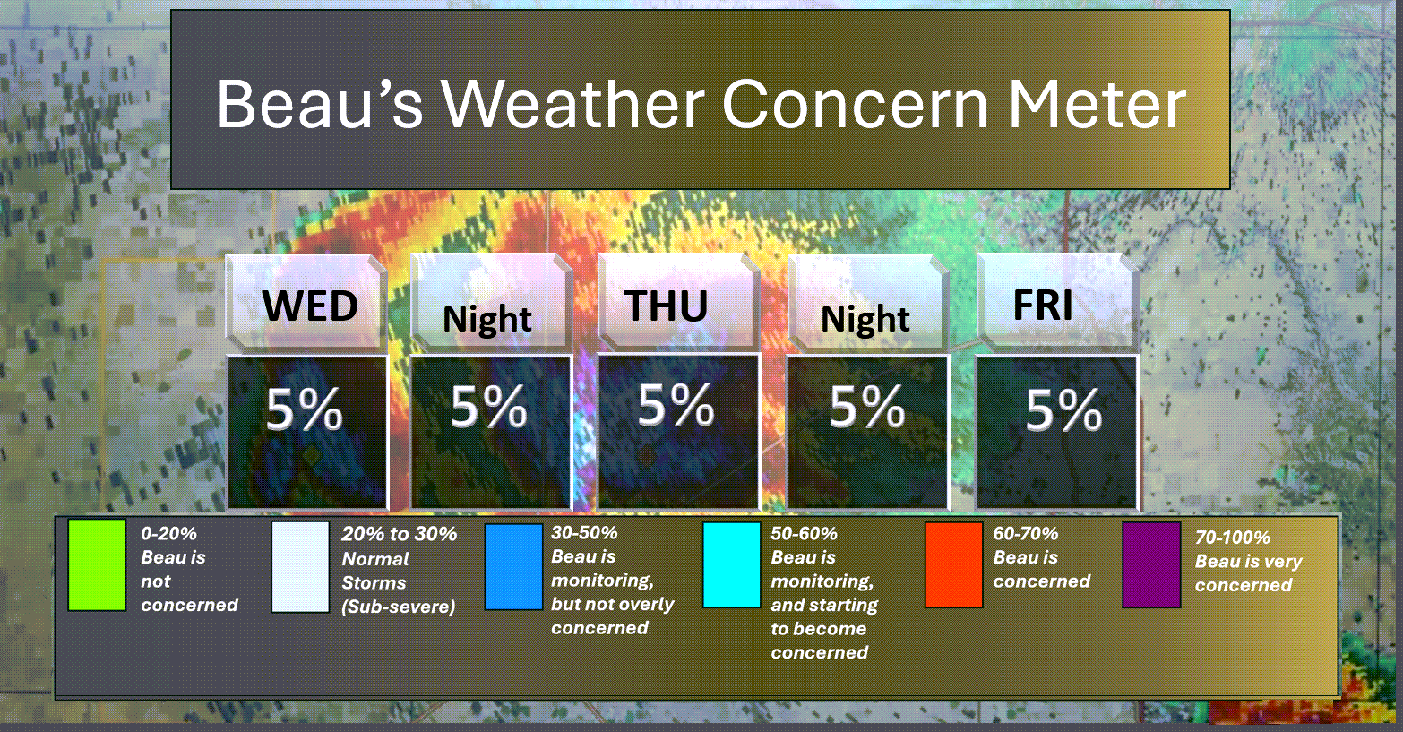 4. Will non-thunderstorm winds top 40 mph? LOW RISK. A small chance of gusts above 40 mph this morning.