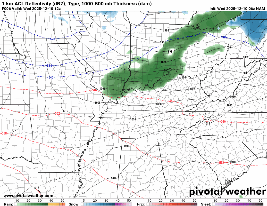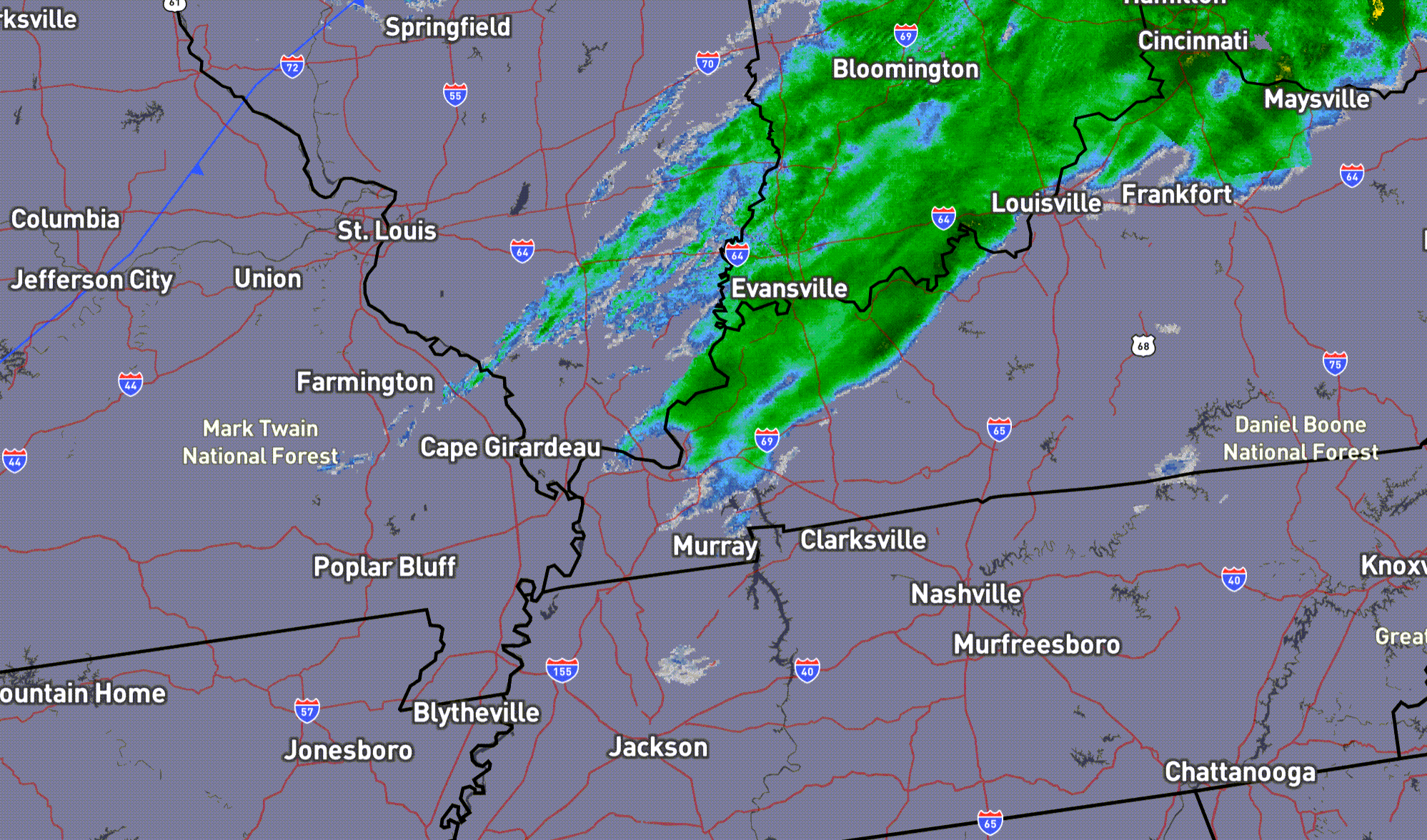 This is what the radar looked like at 6 AM. You can see some patches of light rain over Illinois and Kentucky.