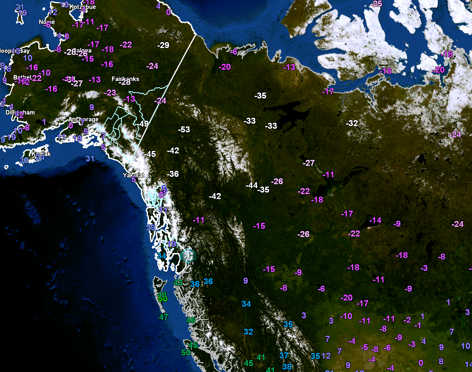 Check out these temperatures in Alaska and Canada. Yes, some locations are -50 below zero! Wind chill values are in the -60s. Incredibly cold.