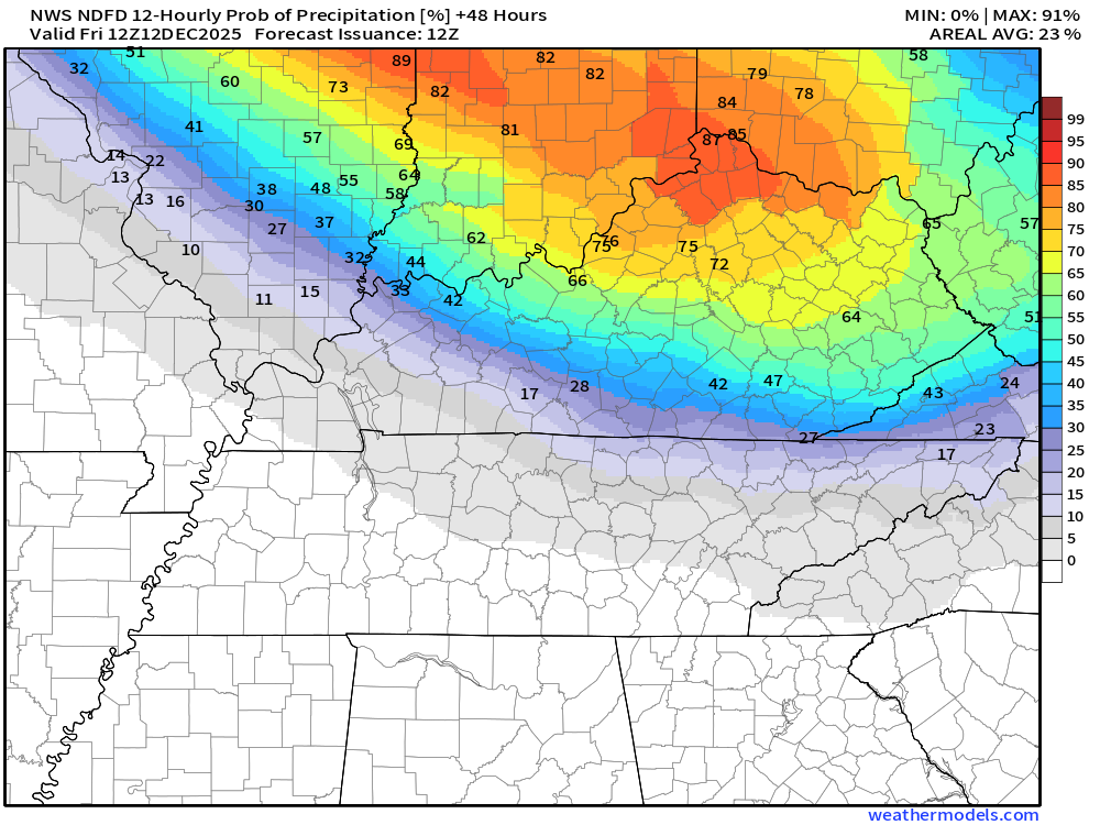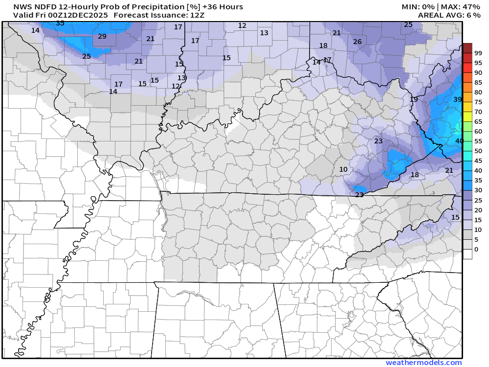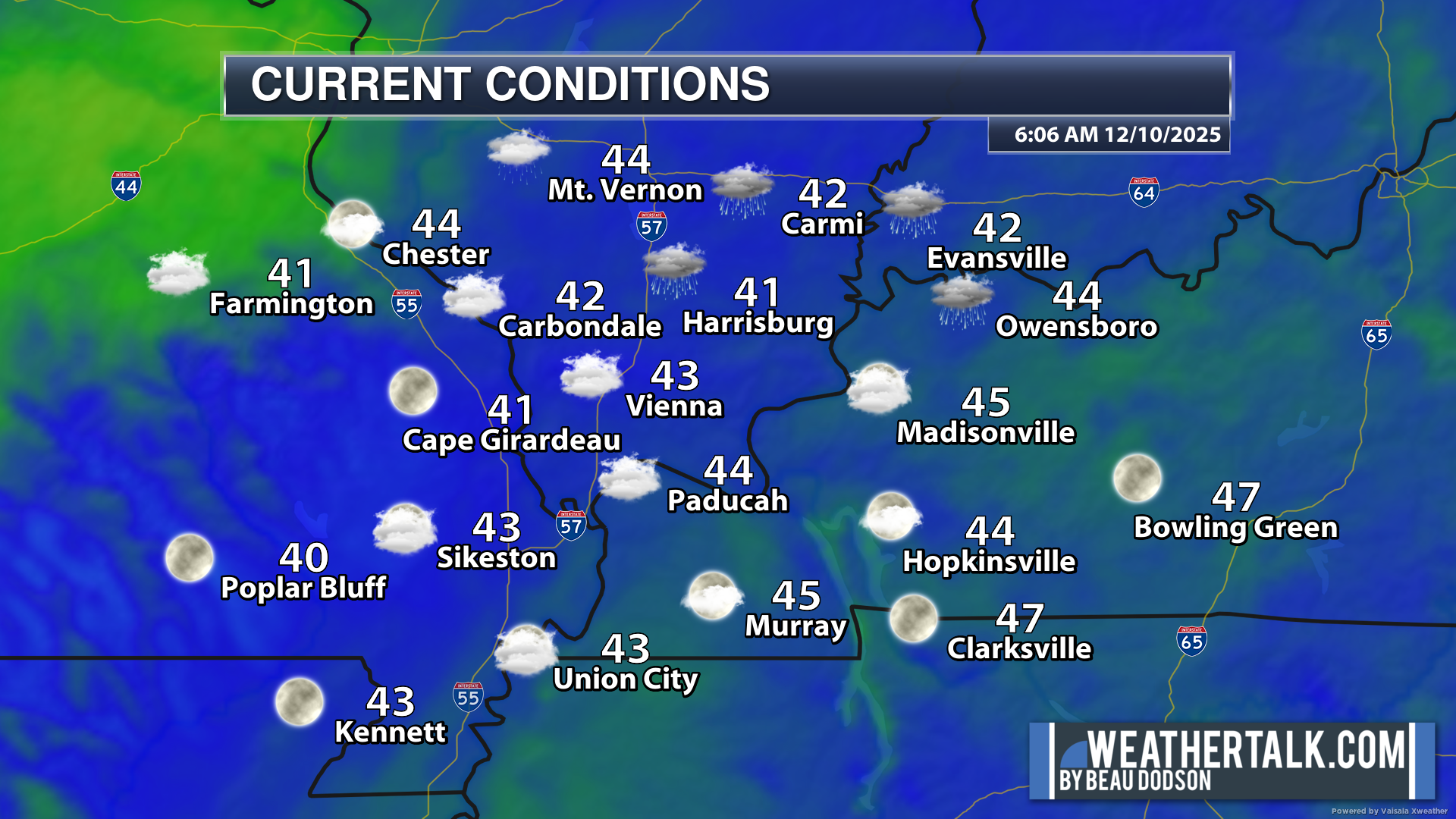 A chance of rain and snow showers on Thursday night/Friday morning. Mainly over southeast Illinois and northwest Kentucky. Chances are higher as you travel east northeast of our region. Any accumulation would be light (none to a dusting). Temperatures will be marginal for accumulation.