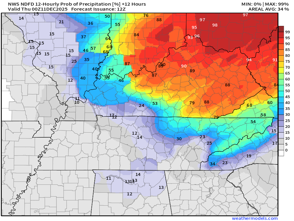 - A low-end chance of rain and snow showers Thursday night over mainly southeast Illinois and northwest Kentucky.